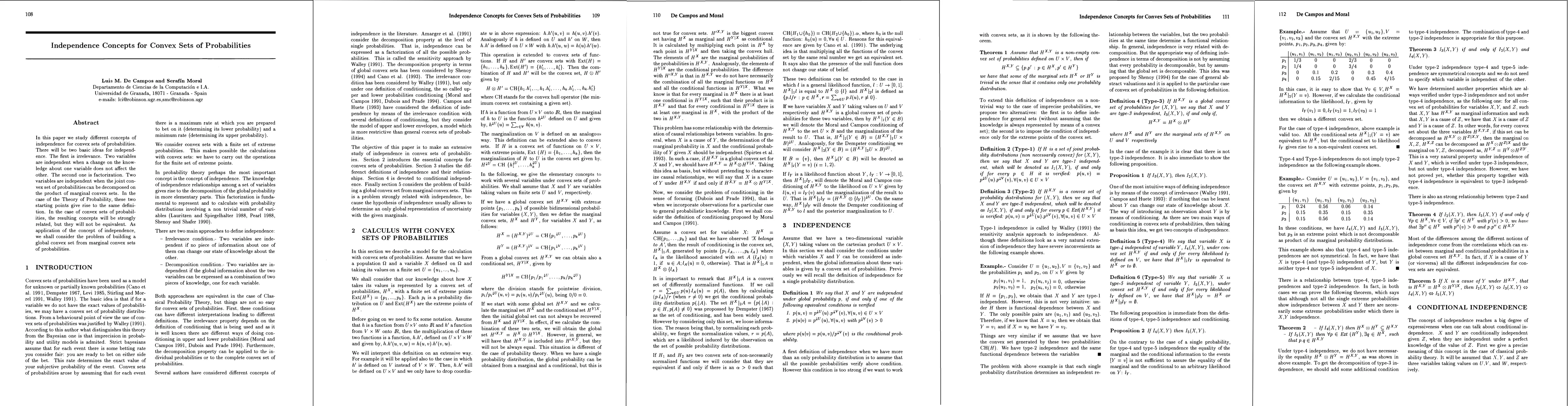 In this paper we study different concepts of independence for convex sets of probabilities. There will be two basic ideas for independence. The first is irrelevance. Two variables are independent when a change on the knowledge about one variable does not affect the other. The second one is factorization. Two variables are independent when the joint convex set of probabilities can be decomposed on the product of marginal convex sets. In the case of the Theory of Probability, these two starting points give rise to the same definition. In the case of convex sets of probabilities, the resulting concepts will be strongly related, but they will not be equivalent. As application of the concept of independence, we shall consider the problem of building a global convex set from marginal convex sets of probabilities.