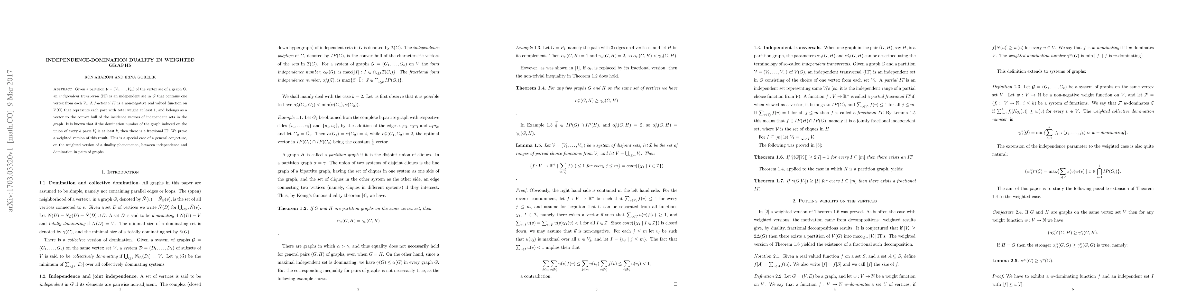 This paper proves a weighted version of the relationship between independent transversals (IT) and domination in graph partitions, showing that a weighted IT exists if the domination number condition holds. It addresses a conjecture on a duality between independence and domination in graph theory.