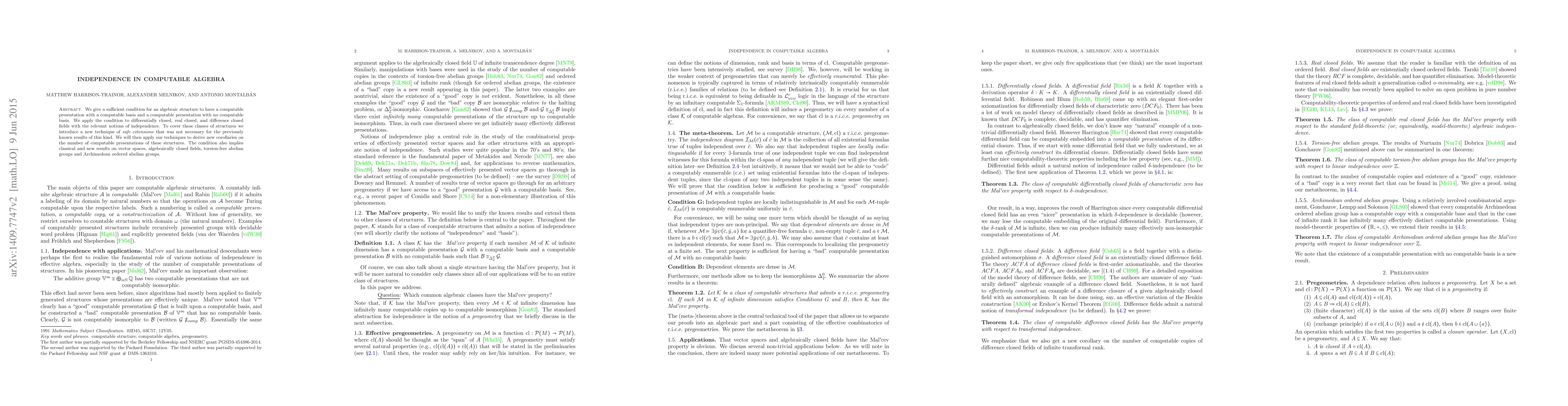 We give a sufficient condition for an algebraic structure to have a computable presentation with a computable basis and a computable presentation with no computable basis. We apply the condition to differentially closed, real closed, and difference closed fields with the relevant notions of independence. To cover these classes of structures we introduce a new technique of safe extensions that was not necessary for the previously known results of this kind. We will then apply our techniques to derive new corollaries on the number of computable presentations of these structures. The condition also implies classical and new results on vector spaces, algebraically closed fields, torsion-free abelian groups and Archimedean ordered abelian groups.