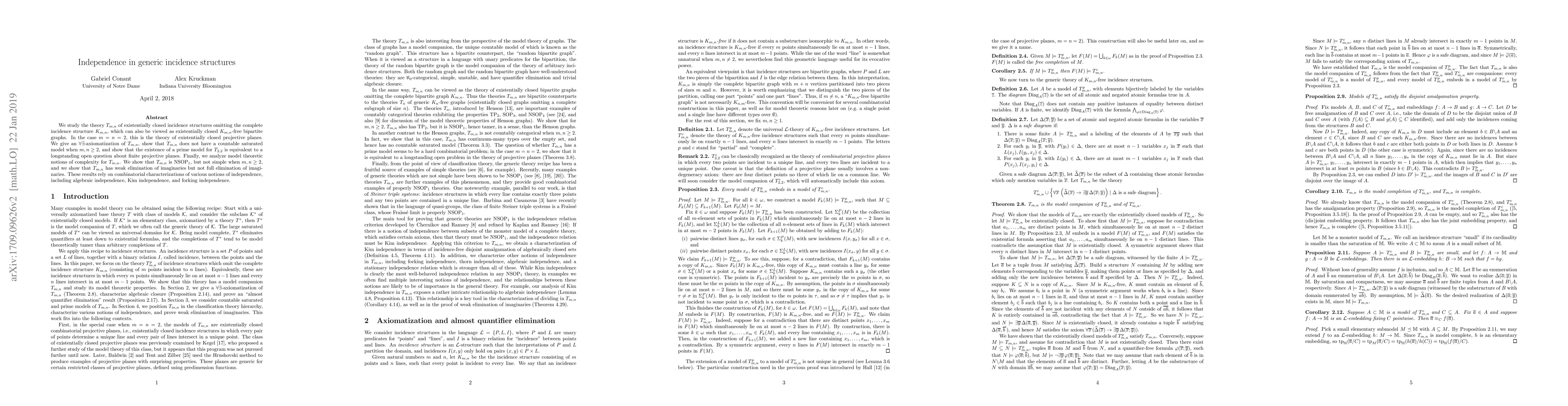 We study the theory $T_{m,n}$ of existentially closed incidence structures omitting the complete incidence structure $K_{m,n}$, which can also be viewed as existentially closed $K_{m,n}$-free bipartite graphs. In the case $m = n = 2$, this is the theory of existentially closed projective planes. We give an $\forall\exists$-axiomatization of $T_{m,n}$, show that $T_{m,n}$ does not have a countable saturated model when $m,n\geq 2$, and show that the existence of a prime model for $T_{2,2}$ is equivalent to a longstanding open question about finite projective planes. Finally, we analyze model theoretic notions of complexity for $T_{m,n}$. We show that $T_{m,n}$ is NSOP$_1$, but not simple when $m,n\geq 2$, and we show that $T_{m,n}$ has weak elimination of imaginaries but not full elimination of imaginaries. These results rely on combinatorial characterizations of various notions of independence, including algebraic independence, Kim independence, and forking independence.