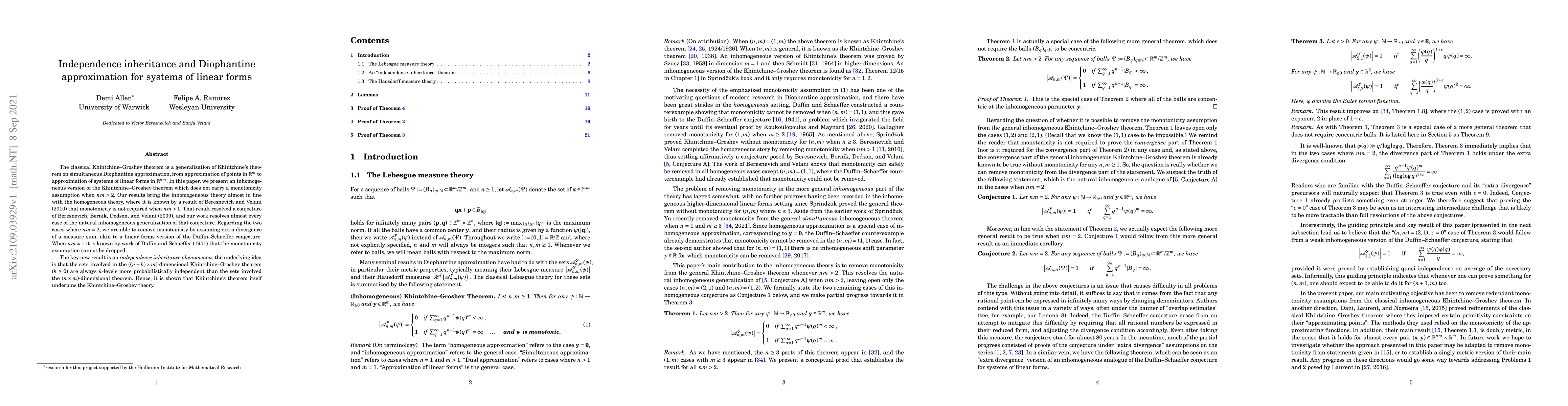 This paper extends the Khintchine-Groshev theorem to an inhomogeneous version, removing the monotonicity assumption for systems of linear forms when $nm>2$. The key result is an independence inheritance phenomenon, showing that higher-dimensional sets are more probabilistically independent, thus underpinning the Khintchine-Groshev theory.