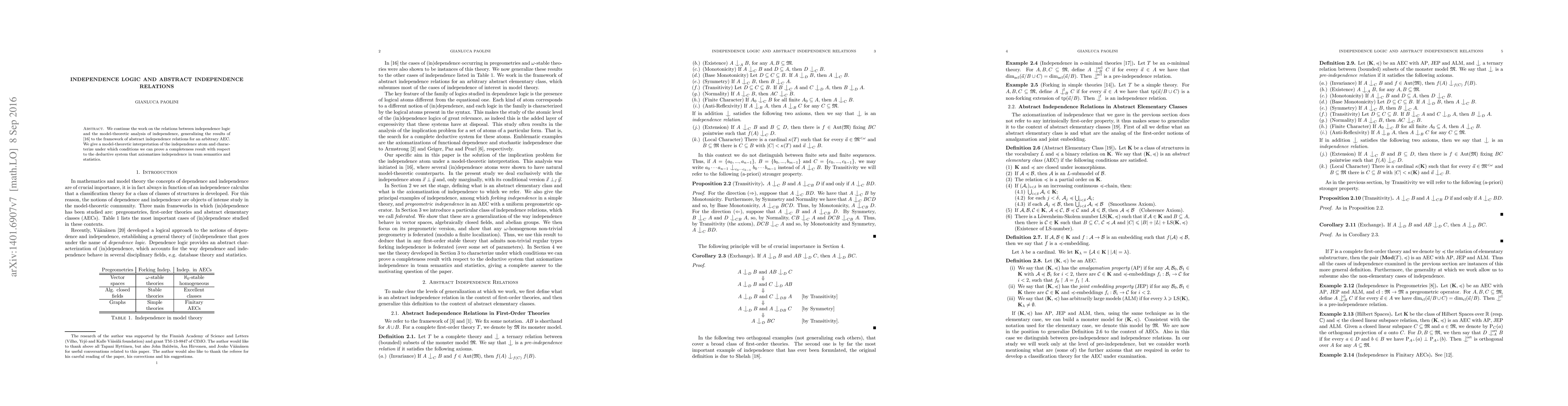 This paper extends the connections between independence logic and model-theoretic independence analysis, applying these results to abstract independence relations in arbitrary AECs. It provides a model-theoretic interpretation of the independence atom and identifies conditions for a completeness result in the deductive system for independence.