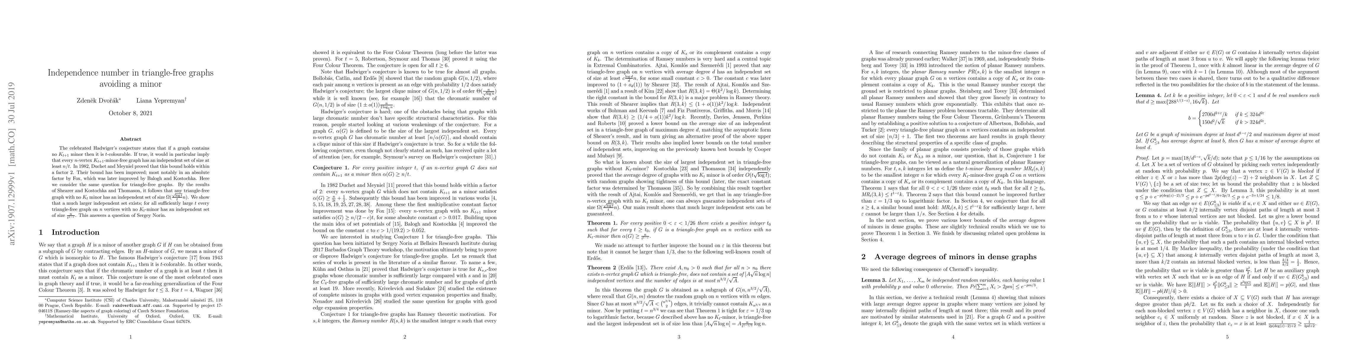 The celebrated Hadwiger's conjecture states that if a graph contains no $K_{t+1}$ minor then it is $t$-colourable. If true, it would in particular imply that every $n$-vertex $K_{t+1}$-minor-free graph has an independent set of size at least $n/t$. In 1982, Duchet and Meyniel proved that this bound holds within a factor $2$. Their bound has been improved; most notably in an absolute factor by Fox, which was later improved by Balogh and Kostochka. Here we consider the same question for triangle-free graphs. By the results of Shearer and Kostochka and Thomason, it follows that any triangle-free graph with no $K_t$ minor has an independent set of size $\Omega(\tfrac{\sqrt{\log{t}}}{t}n)$. We show that a much larger independent set exists; for all sufficiently large $t$ every triangle-free graph on $n$ vertices with no $K_t$-minor has an independent set of size $ \tfrac{n}{t^{1-\varepsilon}}$. This answers a question of Sergey Norin.