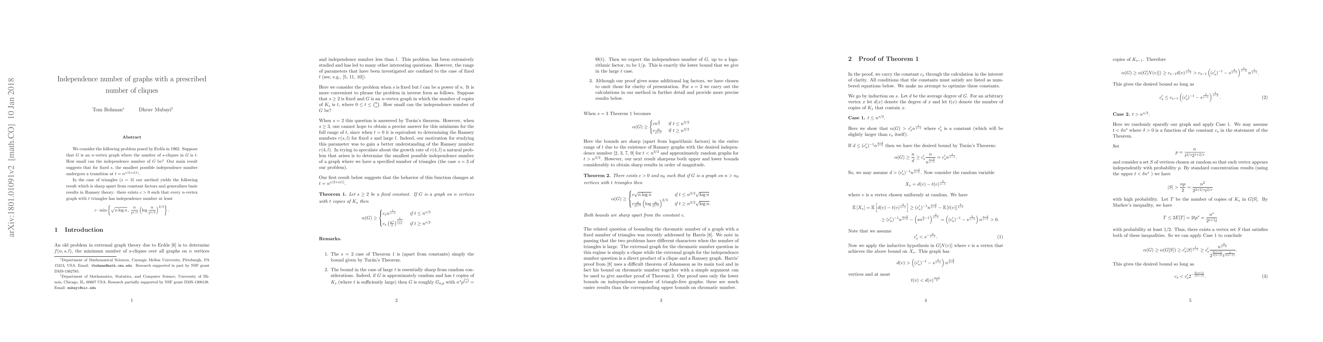 We consider the following problem posed by Erdos in 1962. Suppose that $G$ is an $n$-vertex graph where the number of $s$-cliques in $G$ is $t$. How small can the independence number of $G$ be? Our main result suggests that for fixed $s$, the smallest possible independence number undergoes a transition at $t=n^{s/2+o(1)}$. In the case of triangles ($s=3$) we obtain the following result which is sharp apart from constant factors and generalizes basic results in Ramsey theory: there exists $c>0$ such that every $n$-vertex graph with $t$ triangles has independence number at least $$c \cdot \min\left\{ \sqrt {n \log n}\, , \, \frac{n}{t^{1/3}} \left(\log \frac{n}{ t^{1/3}}\right)^{2/3} \right\}.$$