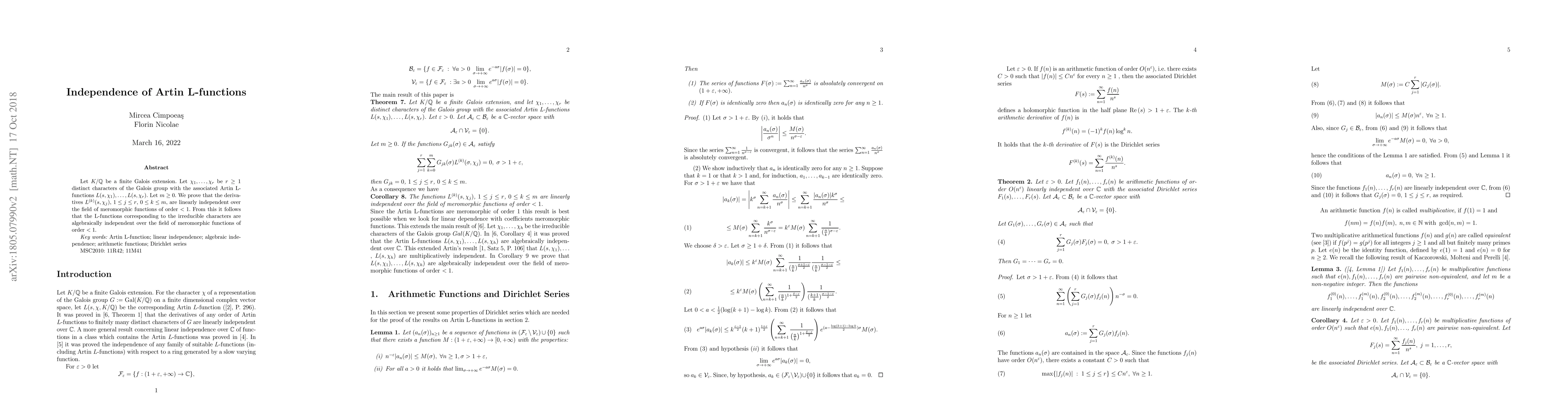 The paper proves the linear independence of derivatives of Artin L-functions associated with distinct characters of a finite Galois extension's Galois group, establishing their algebraic independence over the field of meromorphic functions of order less than 1.