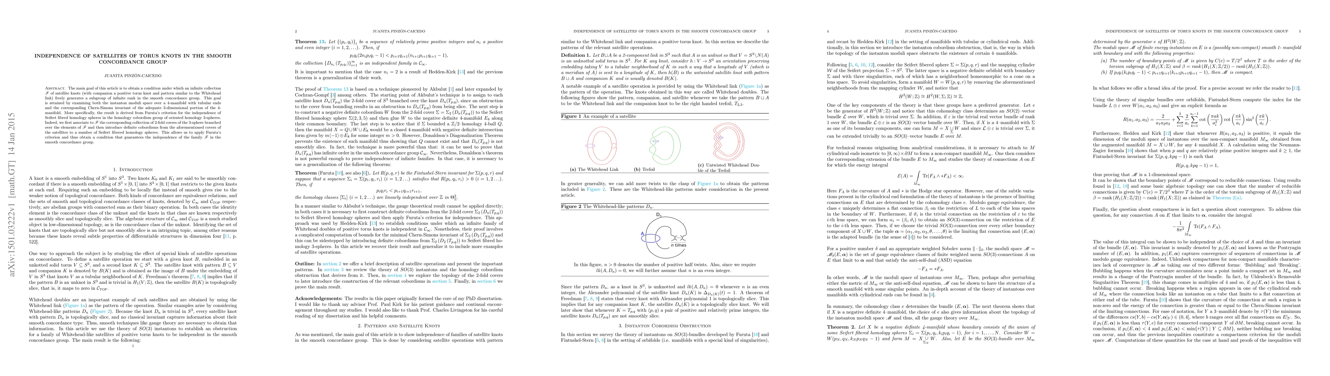 The main goal of this article is to obtain a condition under which an infinite collection $\mathscr{F}$ of satellite knots (with companion a positive torus knot and pattern similar to the Whitehead link) freely generates a subgroup of infinite rank in the smooth concordance group. This goal is attained by examining both the instanton moduli space over a 4-manifold with tubular ends and the corresponding Chern-Simons invariant of the adequate 3-dimensional portion of the 4-manifold. More specifically, the result is derived from Furuta's criterion for the independence of Seifert fibred homology spheres in the homology cobordism group of oriented homology 3-spheres. Indeed, we first associate to $\mathscr{F}$ the corresponding collection of 2-fold covers of the 3-sphere branched over the elements of $\mathscr{F}$ and then introduce definite cobordisms from the aforementioned covers of the satellites to a number of Seifert fibered homology spheres. This allows us to apply Furuta's criterion and thus obtain a condition that guarantees the independence of the family $\mathscr{F}$ in the smooth concordance group.