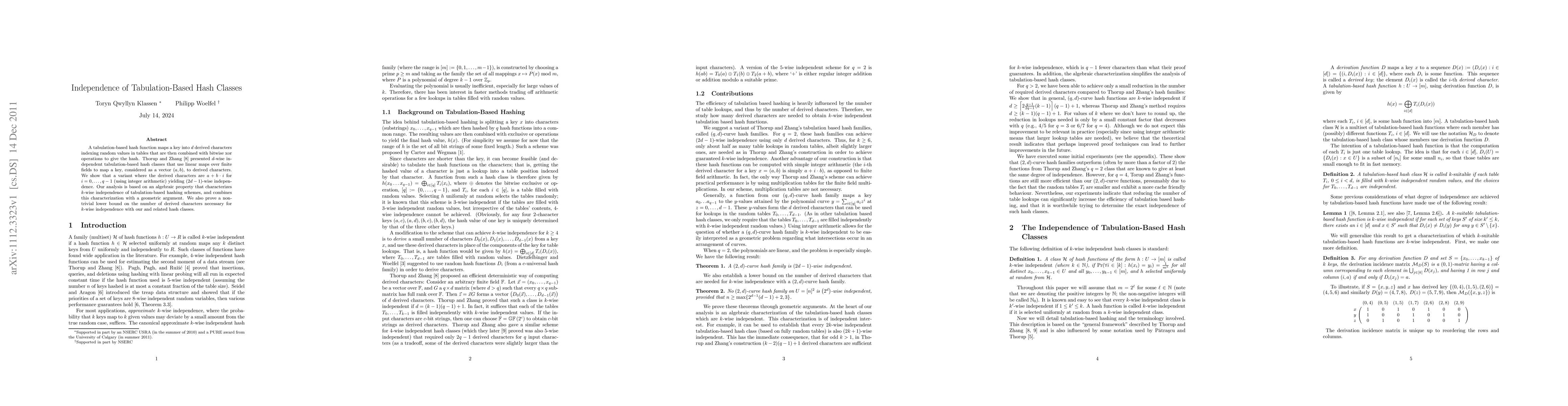A tabulation-based hash function maps a key into d derived characters indexing random values in tables that are then combined with bitwise xor operations to give the hash. Thorup and Zhang (2004) presented d-wise independent tabulation-based hash classes that use linear maps over finite fields to map a key, considered as a vector (a,b), to derived characters. We show that a variant where the derived characters are a+b*i for i=0,..., q-1 (using integer arithmetic) yielding (2d-1)-wise independence. Our analysis is based on an algebraic property that characterizes k-wise independence of tabulation-based hashing schemes, and combines this characterization with a geometric argument. We also prove a non-trivial lower bound on the number of derived characters necessary for k-wise independence with our and related hash classes.
