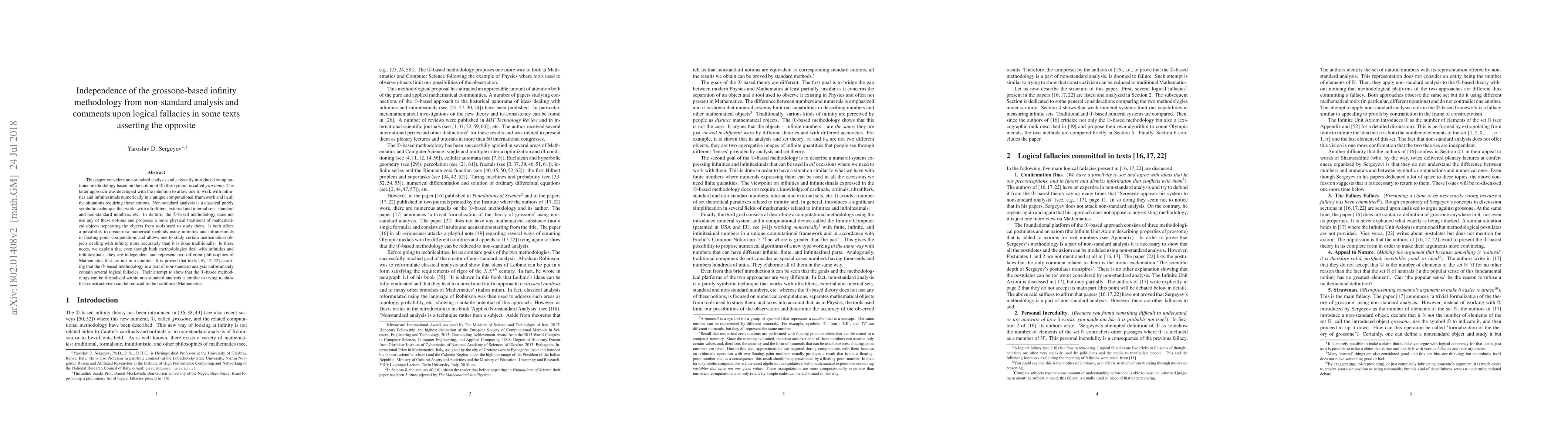 This commentary considers non-standard analysis and a recently introduced computational methodology based on the notion of \G1 (this symbol is called \emph{grossone}). The latter approach was developed with the intention to allow one to work with infinities and infinitesimals numerically in a unique computational framework and in all the situations requiring these notions. Non-standard analysis is a classical purely symbolic technique that works with ultrafilters, external and internal sets, standard and non-standard numbers, etc. In its turn, the \G1-based methodology does not use any of these notions and proposes a more physical treatment of mathematical objects separating the objects from tools used to study them. It both offers a possibility to create new numerical methods using infinities and infinitesimals in floating-point computations and allows one to study certain mathematical objects dealing with infinity more accurately than it is done traditionally. In these notes, we explain that even though both methodologies deal with infinities and infinitesimals, they are independent and represent two different philosophies of Mathematics that are not in a conflict. It is proved that texts \cite{Flunks, Gutman_Kutateladze_2008, Kutateladze_2011} asserting that the \G1-based methodology is a part of non-standard analysis unfortunately contain several logical fallacies. Their attempt to prove that the \G1-based methodology is a part of non-standard analysis is similar to trying to show that constructivism can be reduced to the traditional mathematics.