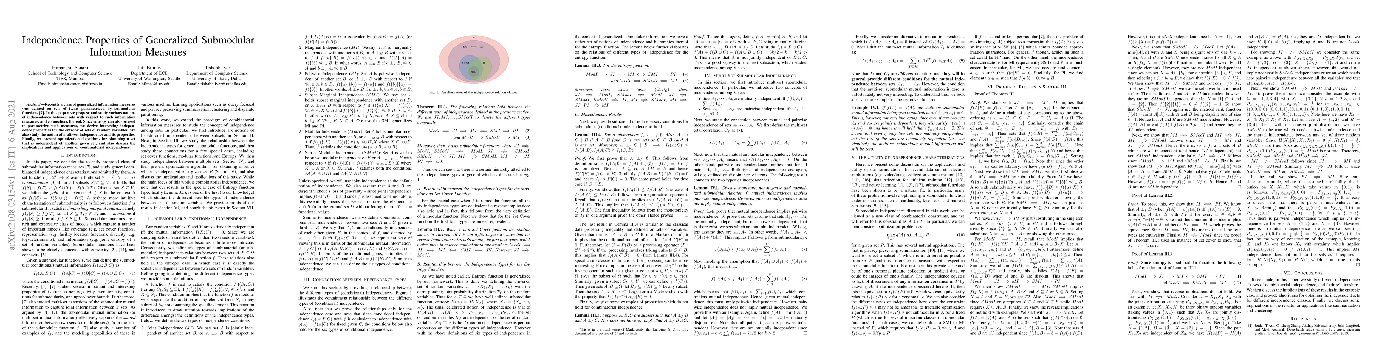 This paper explores generalized submodular information measures and proposes various notions of independence between sets with respect to these measures. It also investigates multi-set independence and presents optimization algorithms for achieving set independence, highlighting applications and implications of combinatorial independence.