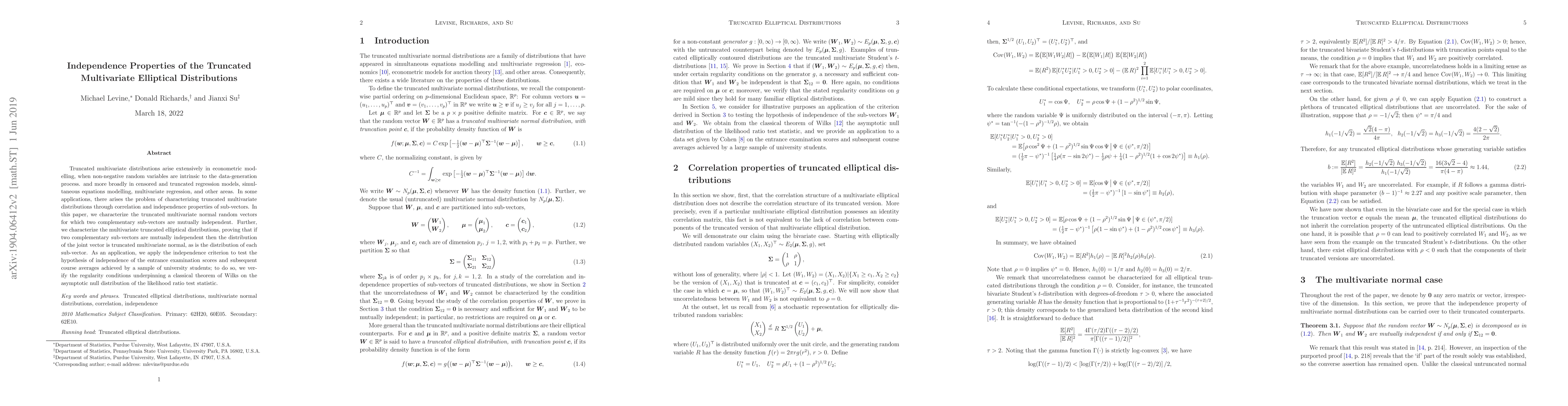 Truncated multivariate distributions arise extensively in econometric modelling when non-negative random variables are intrinsic to the data-generation process. More broadly, truncated multivariate distributions have appeared in censored and truncated regression models, simultaneous equations modelling, multivariate regression, and applications going back to the now-classic papers of Amemiya (1974) and Heckman (1976). In some applications of truncated multivariate distributions, there arises the problem of characterizing the distribution through correlation and independence properties of sub-vectors. In this paper, we characterize the truncated multivariate normal random vectors for which two complementary sub-vectors are mutually independent. Further, we characterize the multivariate truncated elliptical distributions, proving that if two complementary sub-vectors are mutually independent then the distribution of the joint vector is truncated multivariate normal, as is the distribution of each sub-vector. As an application, we apply the independence criterion to test the hypothesis of independence of the entrance examination scores and subsequent course averages achieved by a sample of university students; to do so, we verify the regularity conditions underpinning a classical theorem of Wilks on the asymptotic null distribution of the likelihood ratio test statistic.
