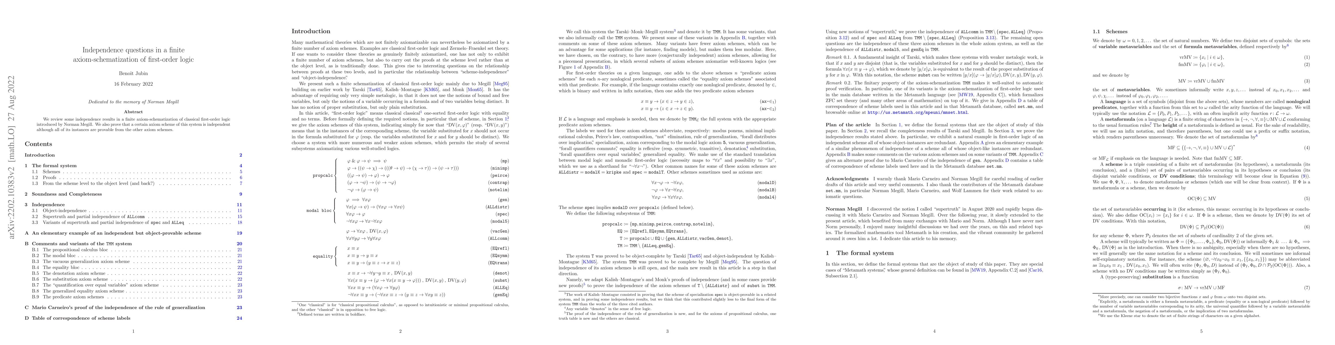Summary: This paper reviews independence results in Norman Megill's finite axiom-schematization of first-order logic and proves that a specific axiom scheme is independent, despite all its instances being provable from other schemes.