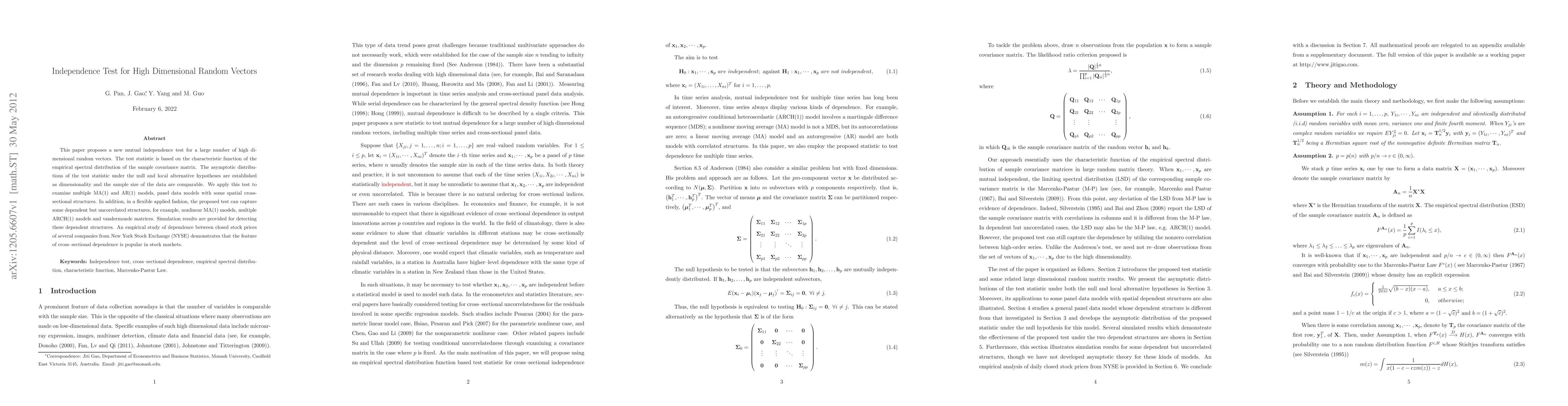 This paper proposes a new mutual independence test for a large number of high dimensional random vectors. The test statistic is based on the characteristic function of the empirical spectral distribution of the sample covariance matrix. The asymptotic distributions of the test statistic under the null and local alternative hypotheses are established as dimensionality and the sample size of the data are comparable. We apply this test to examine multiple MA(1) and AR(1) models, panel data models with some spatial cross-sectional structures. In addition, in a flexible applied fashion, the proposed test can capture some dependent but uncorrelated structures, for example, nonlinear MA(1) models, multiple ARCH(1) models and vandermonde matrices. Simulation results are provided for detecting these dependent structures. An empirical study of dependence between closed stock prices of several companies from New York Stock Exchange (NYSE) demonstrates that the feature of cross--sectional dependence is popular in stock markets.