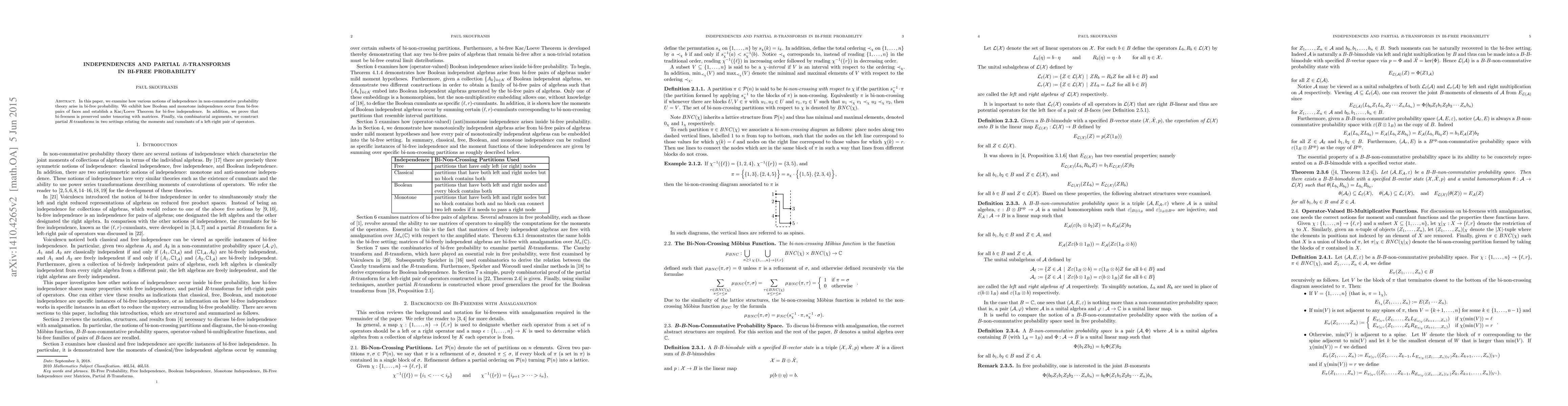 This paper explores independence concepts in bi-free probability, demonstrating the emergence of Boolean and monotone independence from bi-free pairs and establishing a Kac/Loeve Theorem. It also proves that bi-freeness is maintained under matrix tensoring and constructs partial $R$-transforms for relating moments and cumulants of operator pairs.