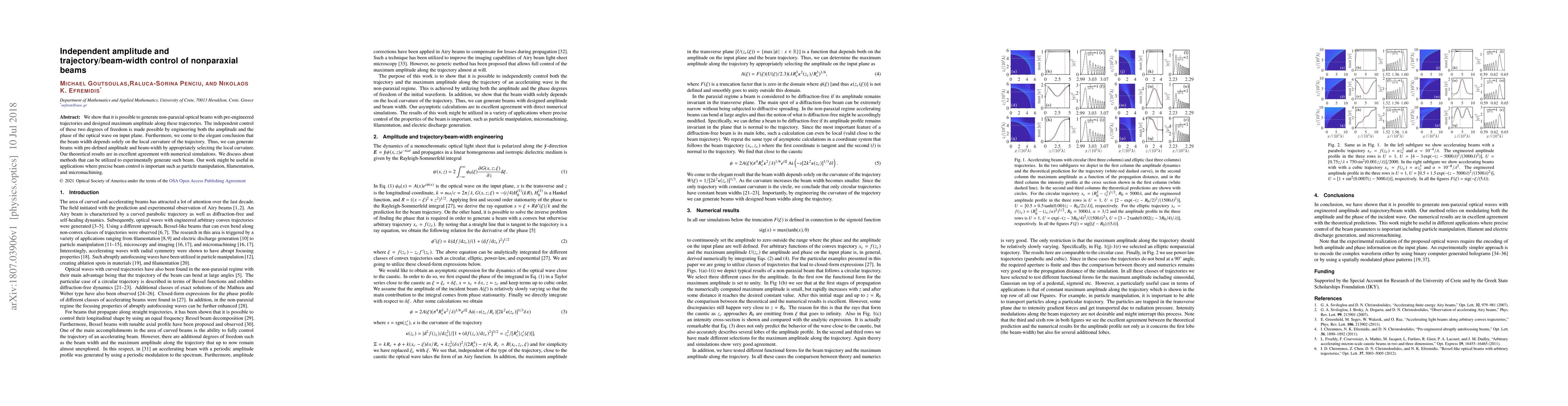 This paper demonstrates the generation of non-paraxial optical beams with independently engineered amplitude and trajectory/beam-width. The beam width is shown to depend on the local trajectory curvature, allowing for precise control over both parameters, with theoretical results validated by simulations.