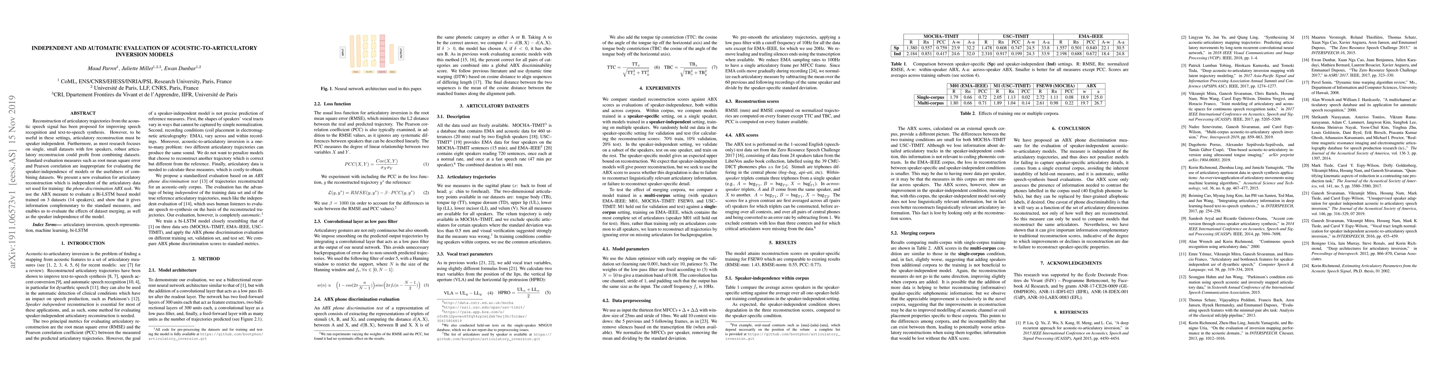 Reconstruction of articulatory trajectories from the acoustic speech signal has been proposed for improving speech recognition and text-to-speech synthesis. However, to be useful in these settings, articulatory reconstruction must be speaker independent. Furthermore, as most research focuses on single, small datasets with few speakers, robust articulatory reconstrucion could profit from combining datasets. Standard evaluation measures such as root mean square error and Pearson correlation are inappropriate for evaluating the speaker-independence of models or the usefulness of combining datasets. We present a new evaluation for articulatory reconstruction which is independent of the articulatory data set used for training: the phone discrimination ABX task. We use the ABX measure to evaluate a Bi-LSTM based model trained on 3 datasets (14 speakers), and show that it gives information complementary to the standard measures, and enables us to evaluate the effects of dataset merging, as well as the speaker independence of the model.