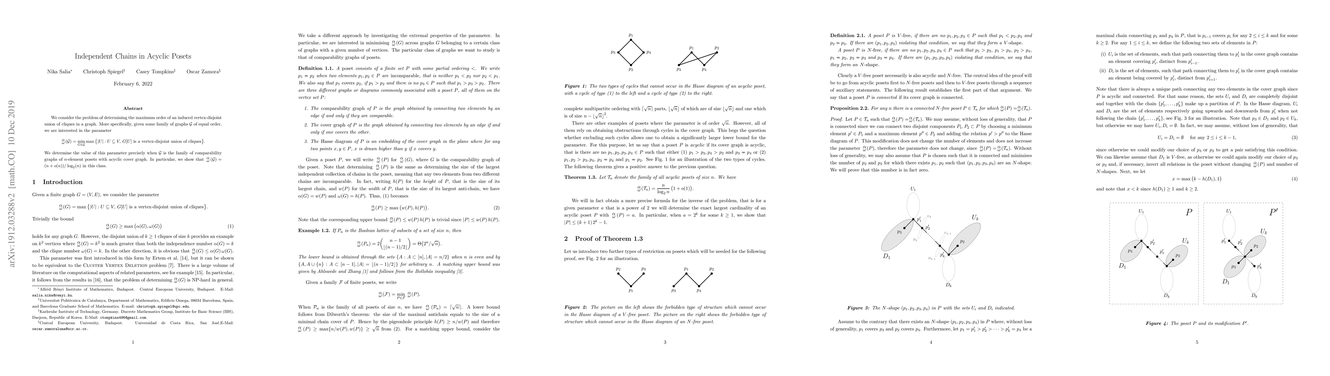 We consider the problem of determining the maximum order of an induced vertex-disjoint union of cliques in a graph. More specifically, given some family of graphs $\mathcal{G}$ of equal order, we are interested in the parameter $a(\mathcal{G}) = \min_{G \in \mathcal{G}} \max \{ |U| : U \subseteq V, G[U] \text{ is a vertex-disjoint union of cliques} \}$. We determine the value of this parameter precisely when $\mathcal{G}$ is the family of comparability graphs of $n$-element posets with acyclic cover graph. In particular, we show that $a(\mathcal{G}) = (n+o(n))/\log_2 (n)$ in this class.