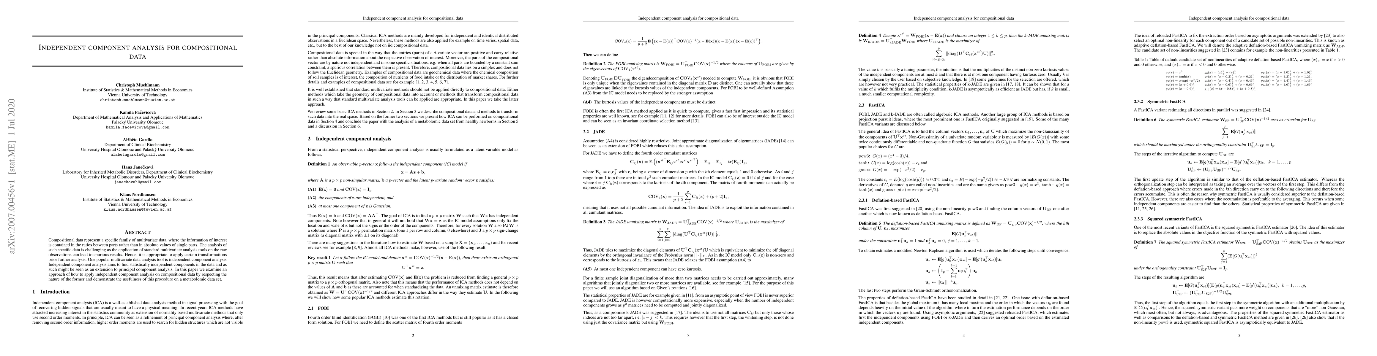 This paper explores applying independent component analysis (ICA) to compositional data, which are multivariate datasets where information lies in ratios rather than absolute values. The study proposes a method to respect the unique nature of compositional data when using ICA, demonstrating its effectiveness through a metabolomic dataset analysis.