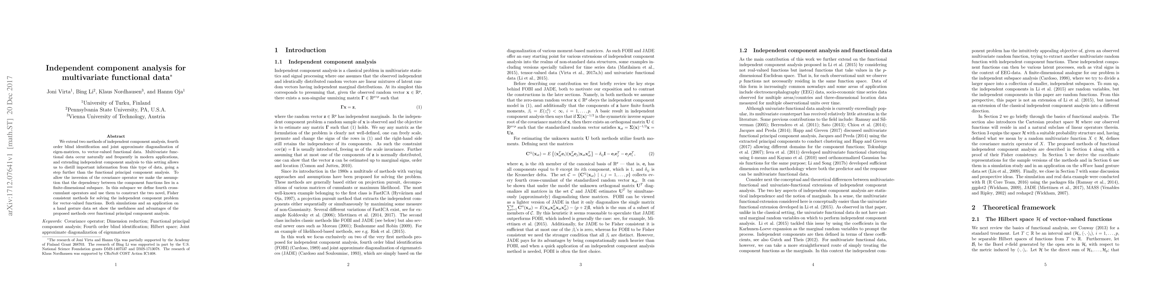 The paper extends methods of independent component analysis (ICA), specifically fourth order blind identification (FOBI) and joint approximate diagonalization of eigen-matrices (JADE), to vector-valued functional data. It assumes the dependency between component functions lies in a finite-dimensional subspace and constructs novel Fisher consistent methods for solving the independent component problem for vector-valued functions.