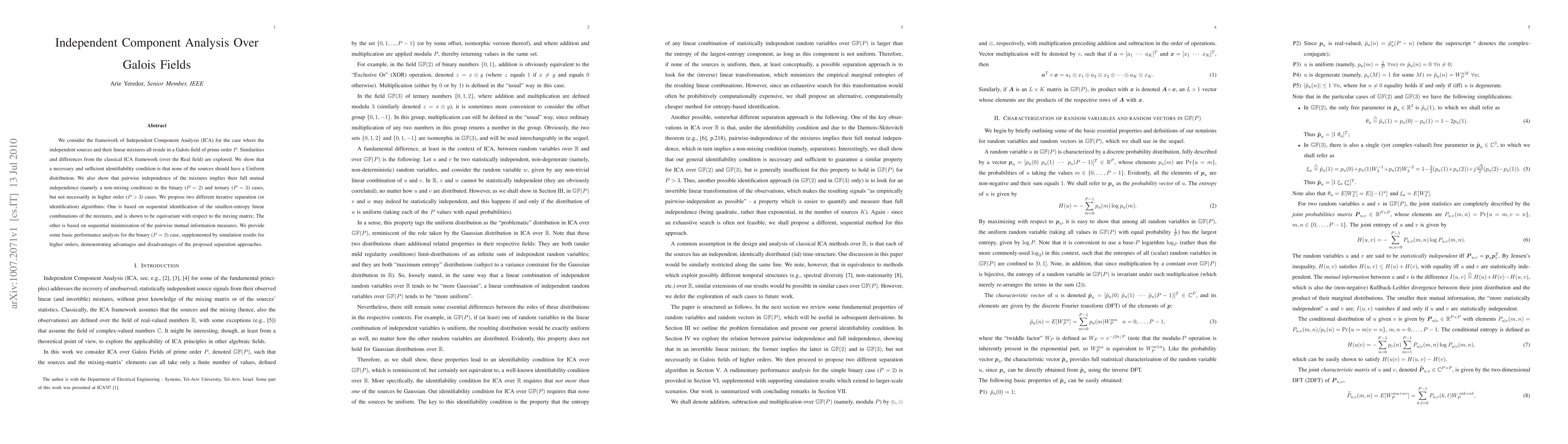 This paper explores Independent Component Analysis (ICA) over Galois fields of prime order, comparing it to classical ICA over the Real field. It proposes two iterative separation algorithms and demonstrates their performance, showing that mutual independence holds in binary and ternary cases but not in higher orders.