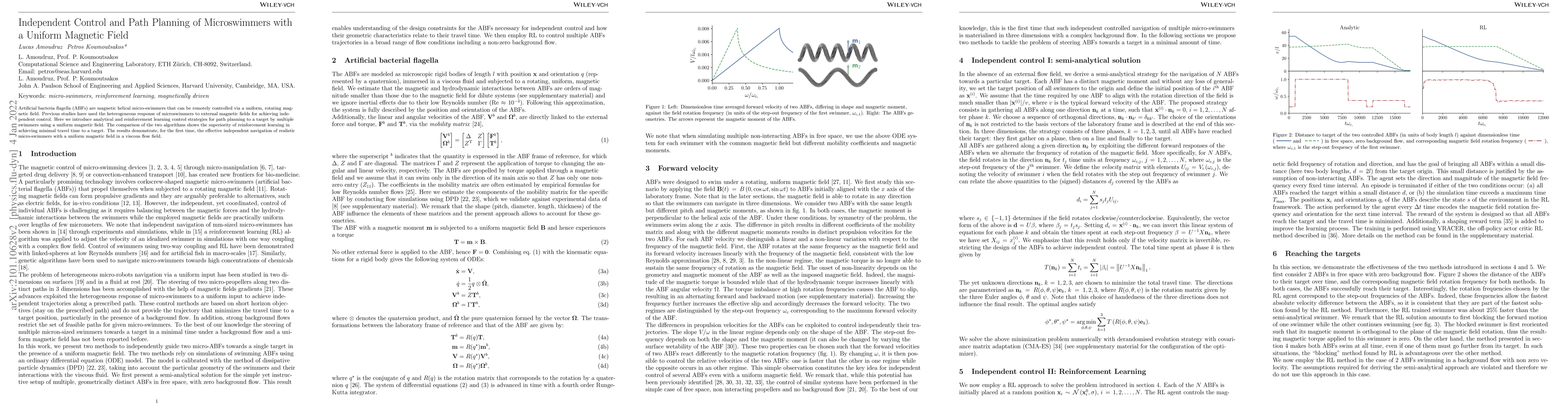 Artificial bacteria flagella (ABFs) are magnetic helical micro-swimmers that can be remotely controlled via a uniform, rotating magnetic field. Previous studies have used the heterogeneous response of microswimmers to external magnetic fields for achieving independent control. Here we introduce analytical and reinforcement learning control strategies for path planning to a target by multiple swimmers using a uniform magnetic field. The comparison of the two algorithms shows the superiority of reinforcement learning in achieving minimal travel time to a target. The results demonstrate, for the first time, the effective independent navigation of realistic micro-swimmers with a uniform magnetic field in a viscous flow field.