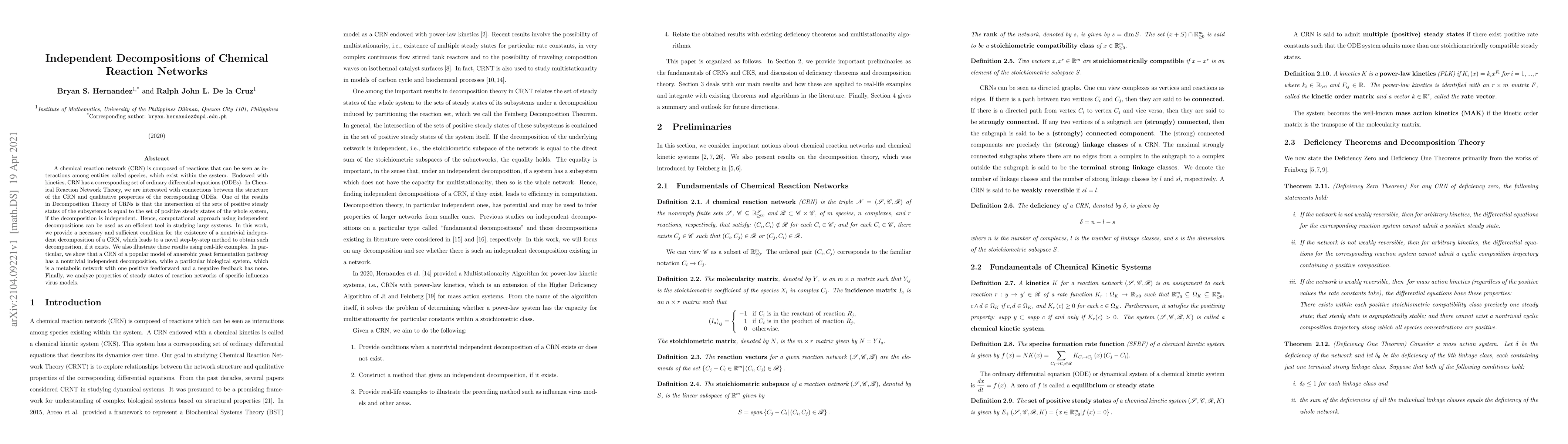 A chemical reaction network (CRN) is composed of reactions that can be seen as interactions among entities called species, which exist within the system. Endowed with kinetics, CRN has a corresponding set of ordinary differential equations (ODEs). In Chemical Reaction Network Theory, we are interested with connections between the structure of the CRN and qualitative properties of the corresponding ODEs. One of the results in Decomposition Theory of CRNs is that the intersection of the sets of positive steady states of the subsystems is equal to the set of positive steady states of the whole system, if the decomposition is independent. Hence, computational approach using independent decompositions can be used as an efficient tool in studying large systems. In this work, we provide a necessary and sufficient condition for the existence of a nontrivial independent decomposition of a CRN, which leads to a novel step-by-step method to obtain such decomposition, if it exists. We also illustrate these results using real-life examples. In particular, we show that a CRN of a popular model of anaerobic yeast fermentation pathway has a nontrivial independent decomposition, while a particular biological system, which is a metabolic network with one positive feedforward and a negative feedback has none. Finally, we analyze properties of steady states of reaction networks of specific influenza virus models.