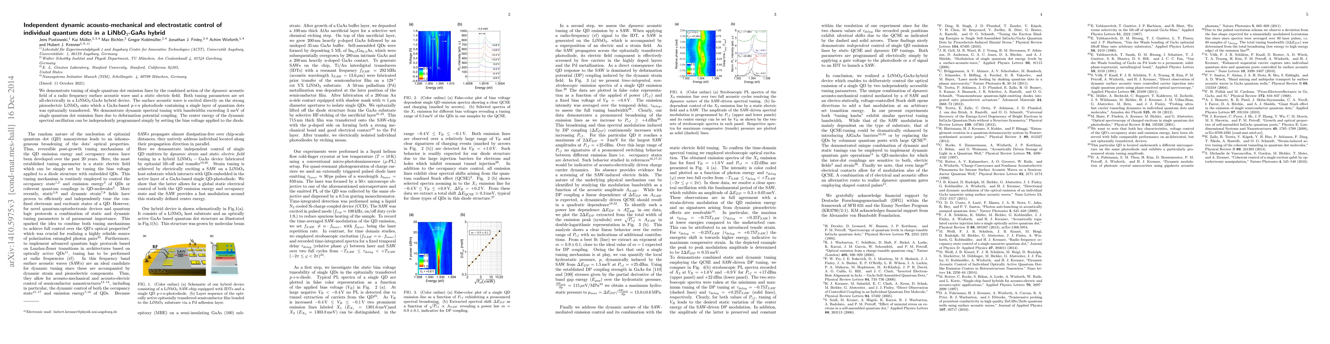 We demonstrate tuning of single quantum dot emission lines by the combined action of the dynamic acoustic field of a radio frequency surface acoustic wave and a static electric field. Both tuning parameters are set all-electrically in a LiNbO$_{3}$-GaAs hybrid device. The surface acoustic wave is excited directly on the strong piezoelectric LiNbO$_{3}$ onto which a GaAs-based p-i-n photodiode containing a single layer of quantum dots was epitaxially transferred. We demonstrate dynamic spectral tuning with bandwidths exceeding 3 meV of single quantum dot emission lines due to deformation potential coupling. The center energy of the dynamic spectral oscillation can be independently programmed simply by setting the bias voltage applied to the diode.