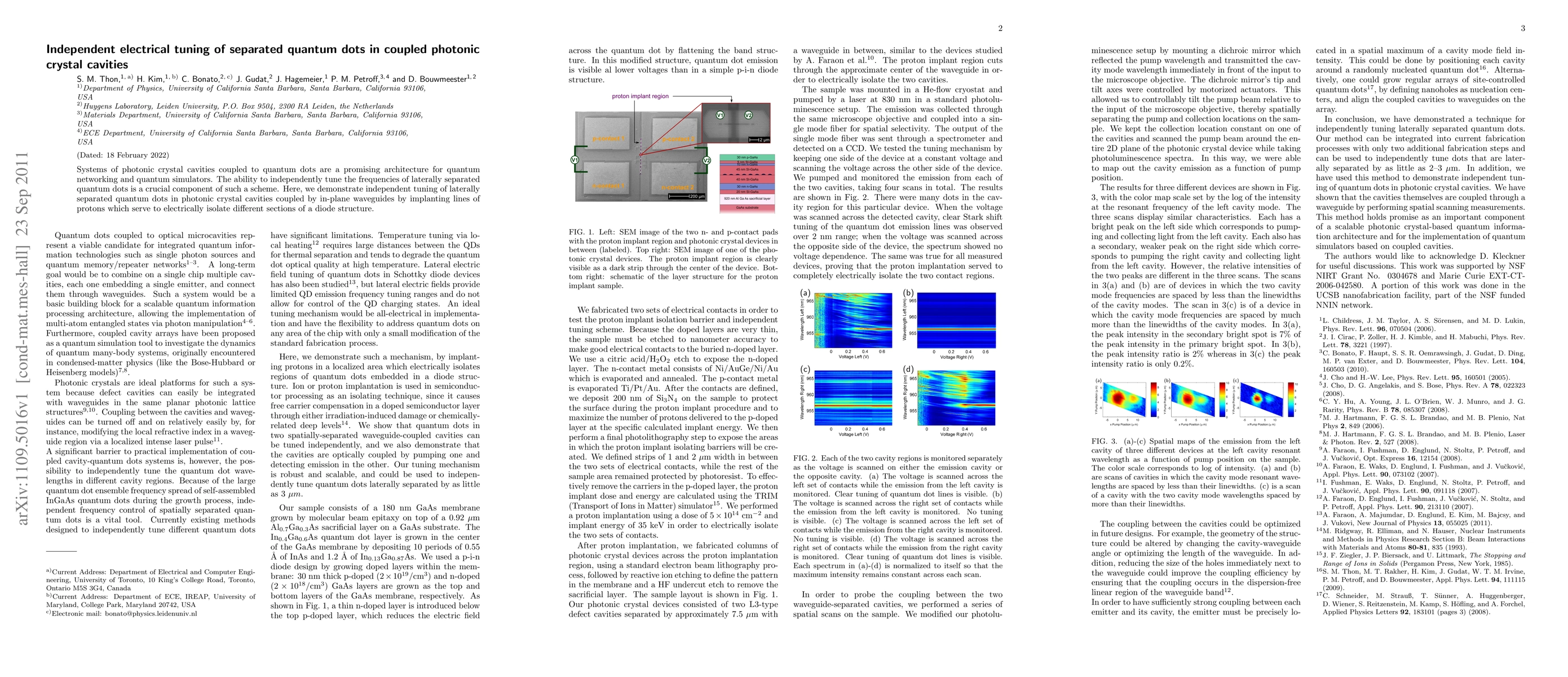 This paper demonstrates independent electrical tuning of laterally separated quantum dots in photonic crystal cavities connected via in-plane waveguides, achieved by proton implantation to electrically isolate different sections of a diode structure, crucial for quantum networking and quantum simulators.