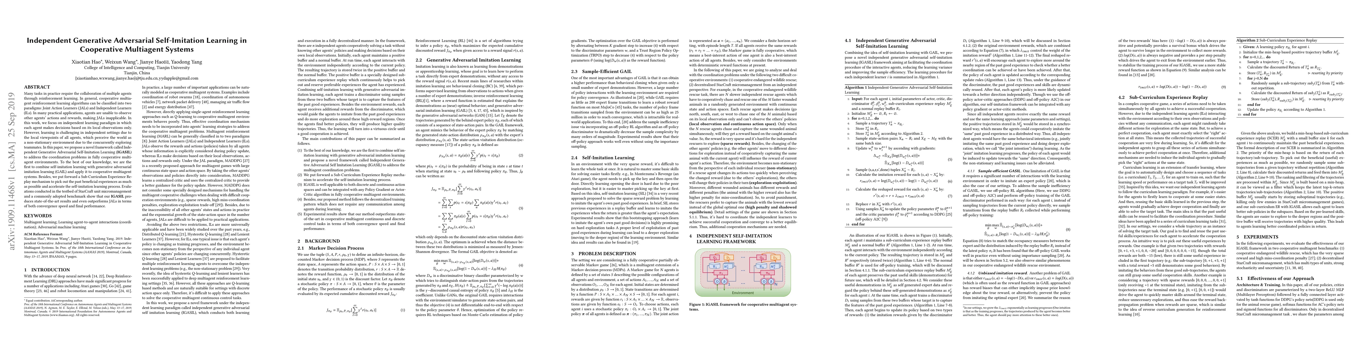 This research introduces Independent Generative Adversarial Self-Imitation Learning (IGASIL) to tackle coordination challenges in cooperative multiagent systems where agents learn independently. The proposed framework combines self-imitation learning with generative adversarial imitation learning, and includes a Sub-Curriculum Experience Replay mechanism for improved learning. Experimental results show IGASIL achieves superior convergence speed and performance compared to joint action learning methods.