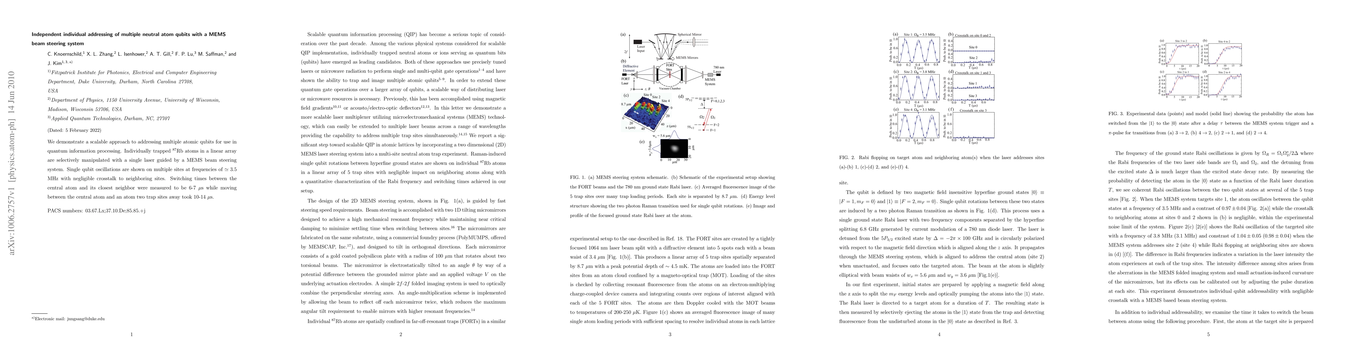 This paper presents a scalable method for addressing multiple neutral atom qubits using a MEMS beam steering system, demonstrating selective manipulation of 87Rb atoms in a linear array with single laser control, achieving 3.5 MHz qubit oscillations with minimal crosstalk. Switching times between atoms range from 6-14 us.
