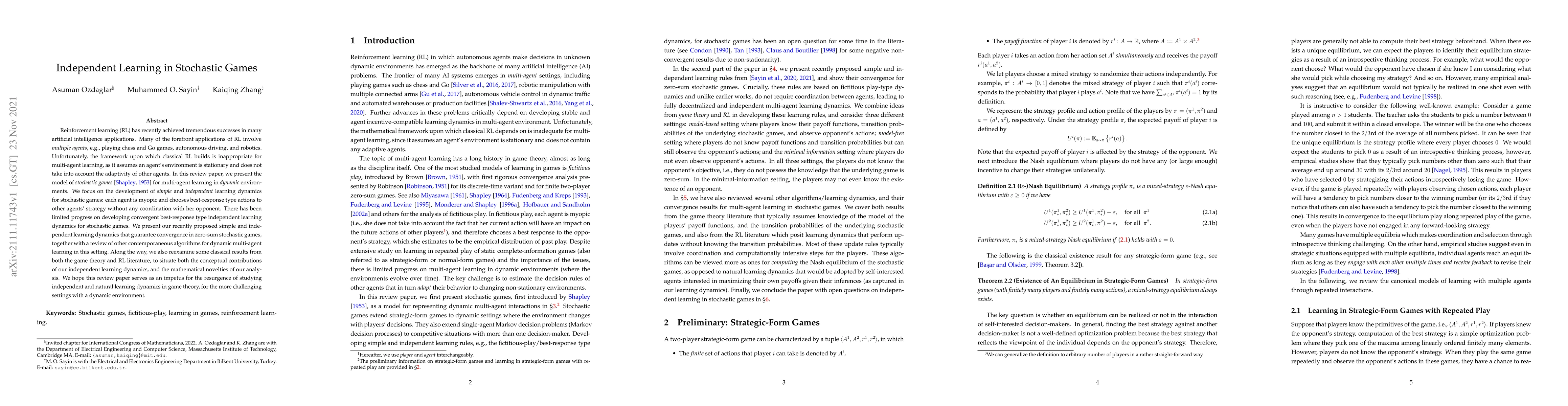 This paper reviews multi-agent reinforcement learning in stochastic games, proposing simple and independent learning dynamics that ensure convergence in zero-sum scenarios. It situates these contributions within classical game theory and RL literature to highlight both conceptual and mathematical advancements.
