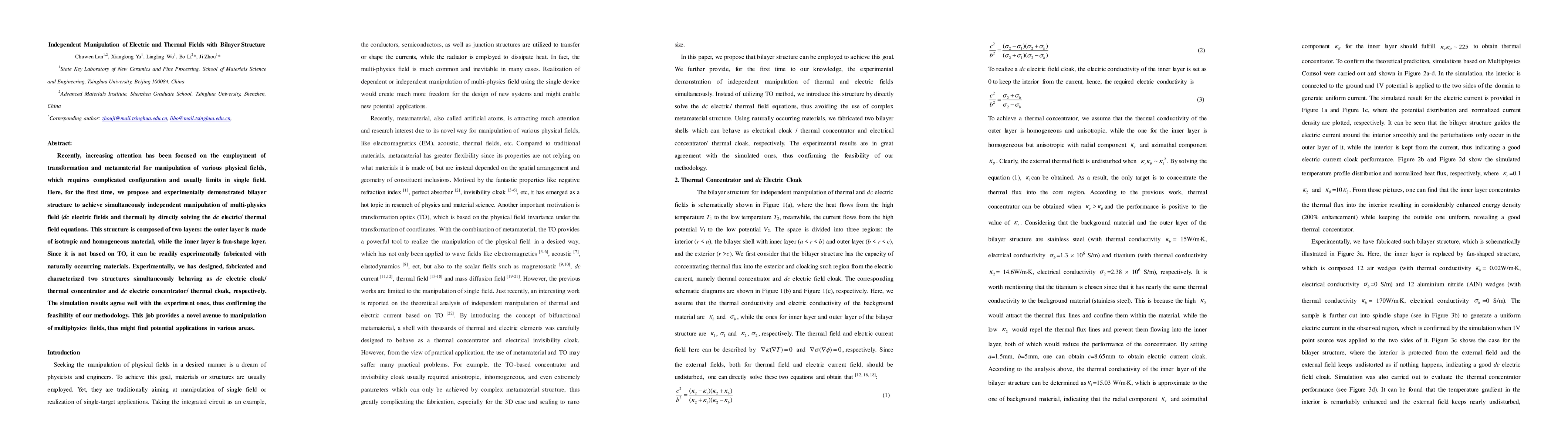 This paper proposes and demonstrates a bilayer structure for independent manipulation of both electric and thermal fields. The structure, composed of an outer isotropic layer and a fan-shape inner layer, allows for simultaneous control of dc electric fields and thermal fields without relying on transformation optics, facilitating experimental fabrication. Experimental results confirm the structure's ability to function as both a dc electric cloak/thermal concentrator and a dc electric concentrator/thermal cloak.