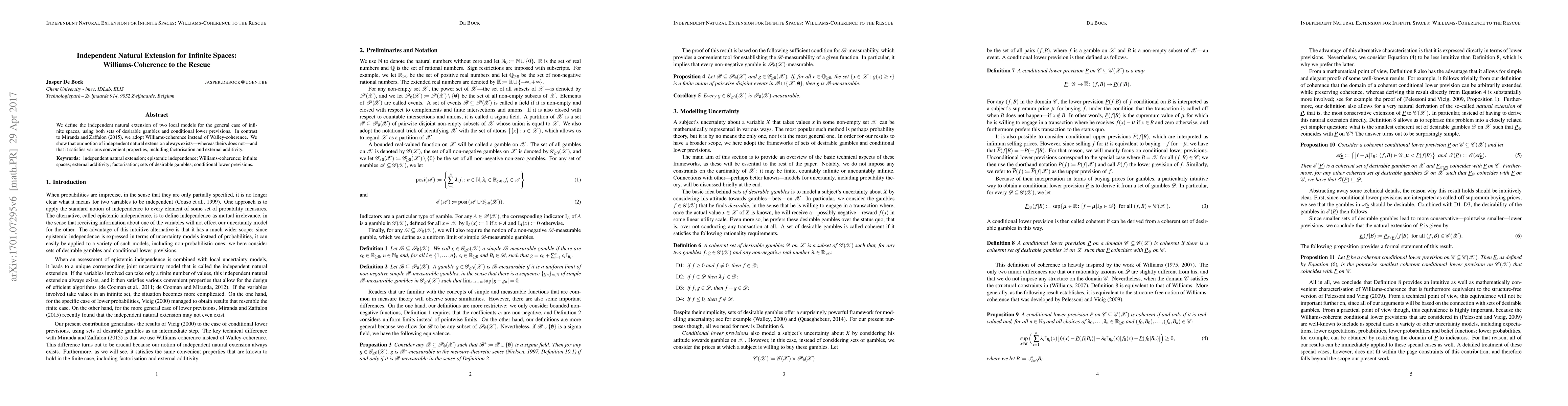 This research introduces the independent natural extension for infinite spaces using Williams-coherence, ensuring its existence unlike a previous method. It highlights properties such as factorisation and external additivity.