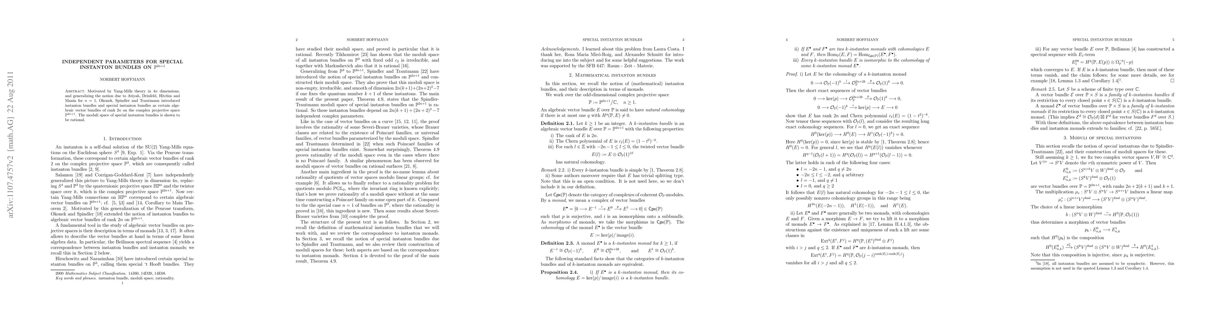 This paper investigates algebraic vector bundles called special instanton bundles on complex projective space P^{2n+1}, generalizing earlier work in Yang-Mills theory and showing that their moduli space is rational. The research focuses on identifying independent parameters for these bundles.