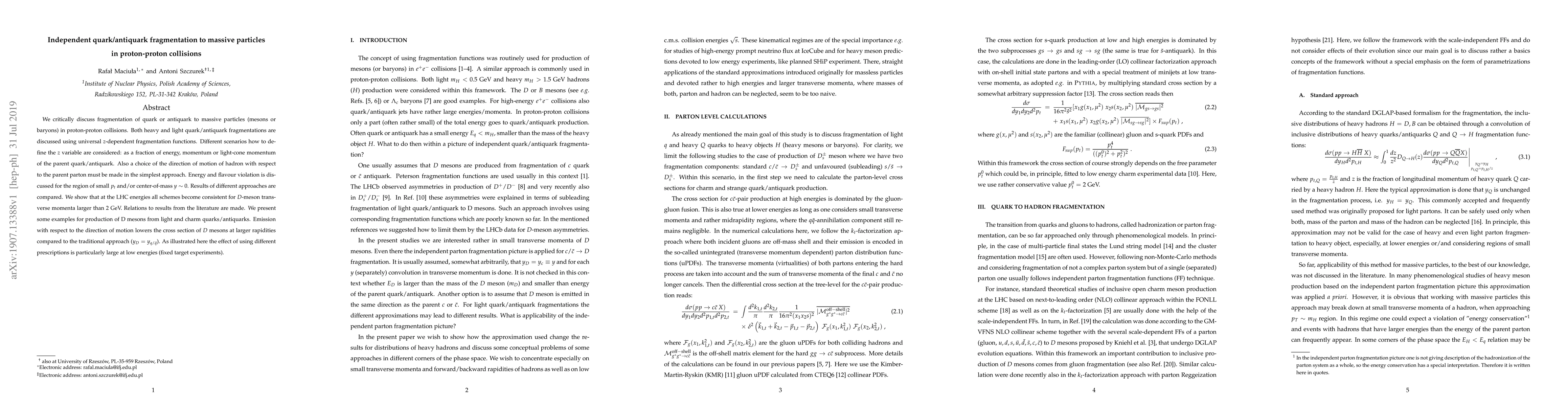 We critically discuss fragmentation of quark or antiquark to massive particles (mesons or baryons) in proton-proton collisions. Both heavy and light quark/antiquark fragmentations are discussed using universal $z$-dependent fragmentation functions. Different scenarios how to define the $z$ variable are considered: as a fraction of energy, momentum or light-cone momentum of the parent quark/antiquark. Also a choice of the direction of motion of hadron with respect to the parent parton must be made in the simplest approach. Energy and flavour violation is discussed for the region of small $p_t$ and/or center-of-mass $y \sim$ 0. Results of different approaches are compared. We show that at the LHC energies all schemes become consistent for $D$-meson transverse momenta larger than $2$ GeV. Relations to results from the literature are made. We present some examples for production of D mesons from light and charm quarks/antiquarks. Emission with respect to the direction of motion lowers the cross section of $D$ mesons at larger rapidities compared to the traditional approach ($y_D = y_{q/\bar q}$). As illustrated here the effect of using different prescriptions is particularly large at low energies (fixed target experiments).