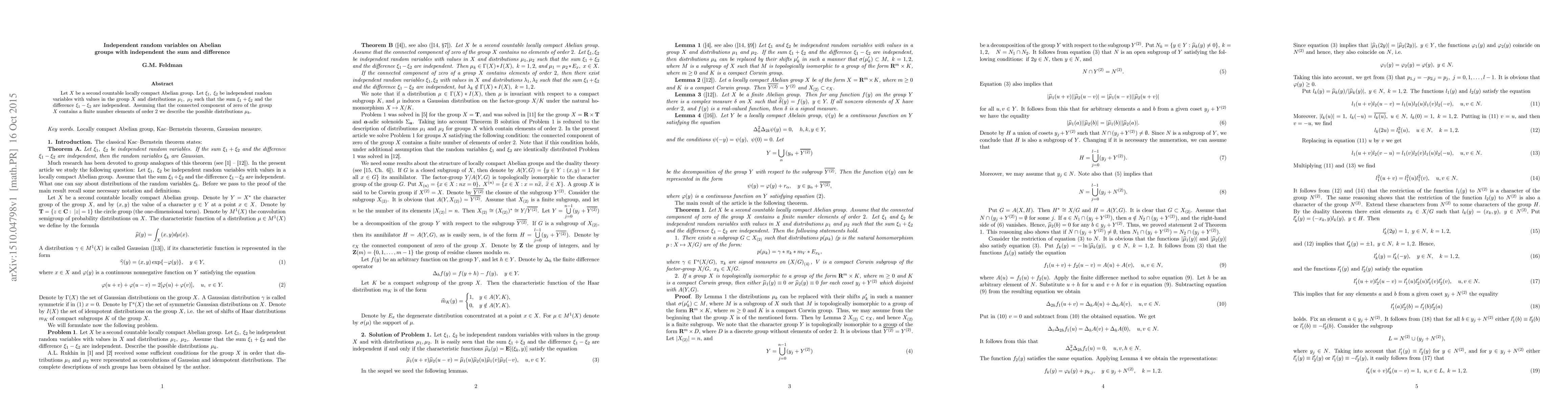 Let X be a second countable locally compact Abelian group. Let $\xi_1, \xi_2$ be independent random variables with values in the group X and distributions $\mu_1, \mu_2$ such that the sum $\xi_1+\xi_2$ and the difference $\xi_1-\xi_2$ are independent. Assuming that the connected component of zero of the group $X$ contains a finite number elements of order 2 we describe the possible distributions $\mu_k$.
