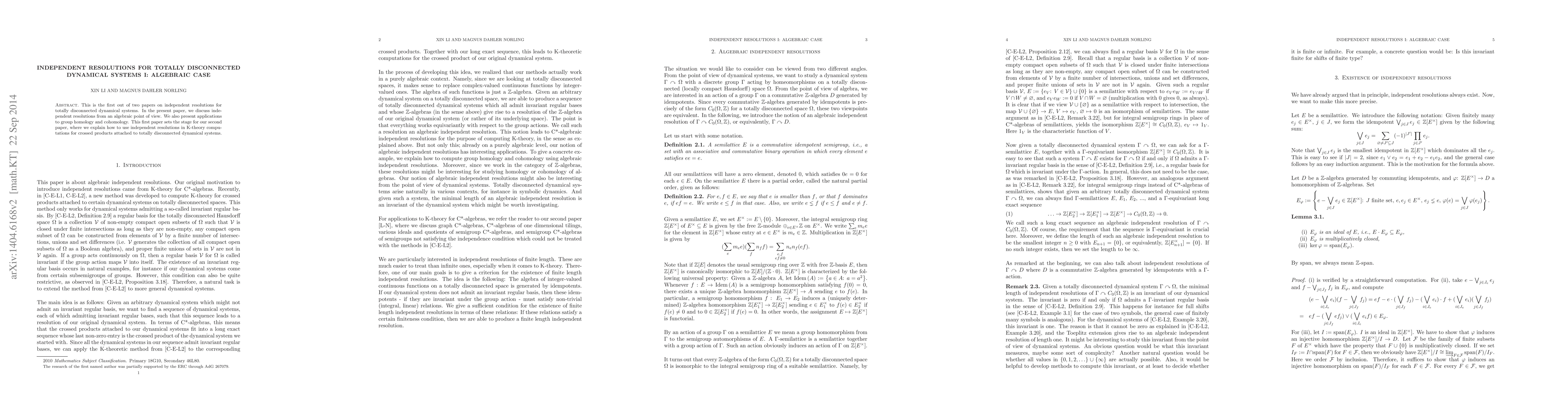 This paper, the first in a series on independent resolutions for totally disconnected dynamical systems, focuses on the algebraic perspective. It introduces independent resolutions and applies them to group homology and cohomology, paving the way for the second paper to utilize these resolutions in K-theory computations for crossed products related to such dynamical systems.