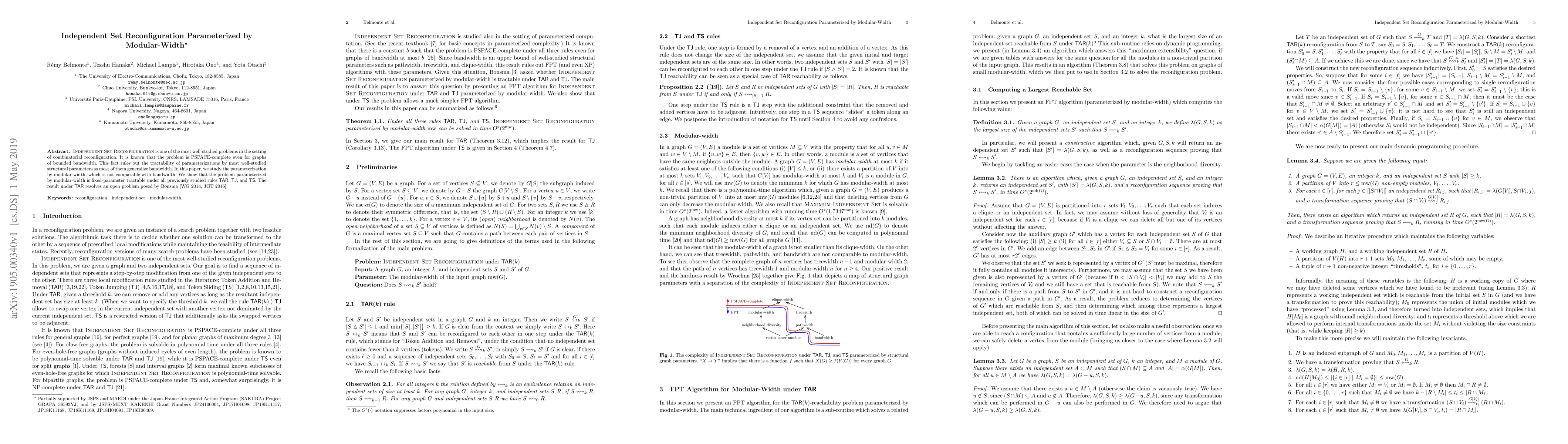 This paper investigates Independent Set Reconfiguration parameterized by modular-width, demonstrating fixed-parameter tractability under various reconfiguration rules (TAR, TJ, and TS). This resolves an open problem regarding the tractability of this problem when parameterized differently from bandwidth.