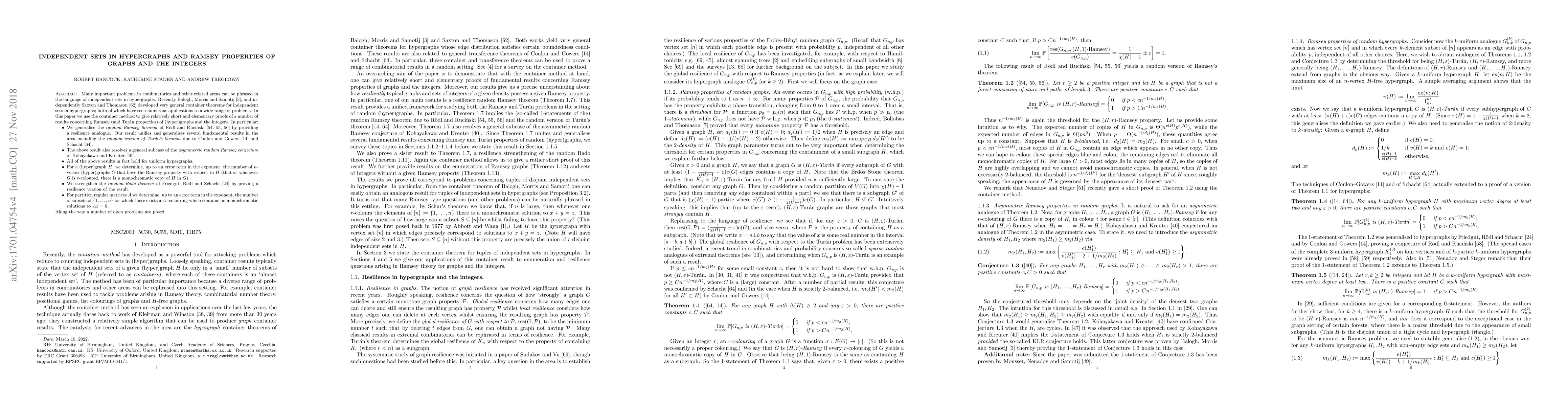 Many important problems in combinatorics and other related areas can be phrased in the language of independent sets in hypergraphs. Recently Balogh, Morris and Samotij, and independently Saxton and Thomason developed very general container theorems for independent sets in hypergraphs; both of which have seen numerous applications to a wide range of problems. In this paper we use the container method to give relatively short and elementary proofs of a number of results concerning Ramsey (and Tur\'an) properties of (hyper)graphs and the integers. In particular: (i) We generalise the random Ramsey theorem of R\"odl and Ruci\'nski by providing a resilience analogue. Our result unifies and generalises several fundamental results in the area including the random version of Tur\'an's theorem due to Conlon and Gowers and Schacht. (ii) The above result also resolves a general subcase of the asymmetric random Ramsey conjecture of Kohayakawa and Kreuter. (iii) All of the above results in fact hold for uniform hypergraphs. (iv) For a (hyper)graph $H$, we determine, up to an error term in the exponent, the number of $n$-vertex (hyper)graphs $G$ that have the Ramsey property with respect to $H$ (that is, whenever $G$ is $r$-coloured, there is a monochromatic copy of $H$ in $G$). (v) We strengthen the random Rado theorem of Friedgut, R\"odl and Schacht by proving a resilience version of the result. (vi) For partition regular matrices $A$ we determine, up to an error term in the exponent, the number of subsets of $\{1,\dots,n\}$ for which there exists an $r$-colouring which contains no monochromatic solutions to $Ax=0$. Along the way a number of open problems are posed.