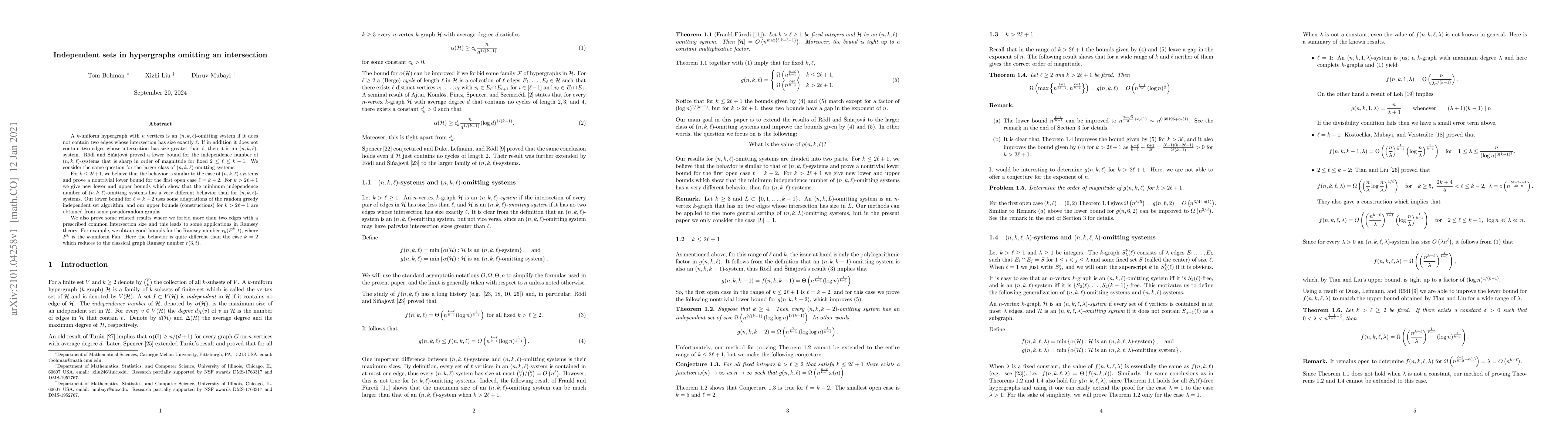 A $k$-uniform hypergraph with $n$ vertices is an $(n,k,\ell)$-omitting system if it does not contain two edges whose intersection has size exactly $\ell$. If in addition it does not contain two edges whose intersection has size greater than $\ell$, then it is an $(n,k,\ell)$-system. R\"{o}dl and \v{S}i\v{n}ajov\'{a} proved a lower bound for the independence number of $(n,k,\ell)$-systems that is sharp in order of magnitude for fixed $2 \le \ell \le k-1$. We consider the same question for the larger class of $(n,k,\ell)$-omitting systems. For $k\le 2\ell+1$, we believe that the behavior is similar to the case of $(n,k,\ell)$-systems and prove a nontrivial lower bound for the first open case $\ell=k-2$. For $k>2\ell+1$ we give new lower and upper bounds which show that the minimum independence number of $(n,k,\ell)$-omitting systems has a very different behavior than for $(n,k,\ell)$-systems. Our lower bound for $\ell=k-2$ uses some adaptations of the random greedy independent set algorithm, and our upper bounds (constructions) for $k> 2\ell+1$ are obtained from some pseudorandom graphs. We also prove some related results where we forbid more than two edges with a prescribed common intersection size and this leads to some applications in Ramsey theory. For example, we obtain good bounds for the Ramsey number $r_{k}(F^{k},t)$, where $F^{k}$ is the $k$-uniform Fan. Here the behavior is quite different than the case $k=2$ which reduces to the classical graph Ramsey number $r(3,t)$.