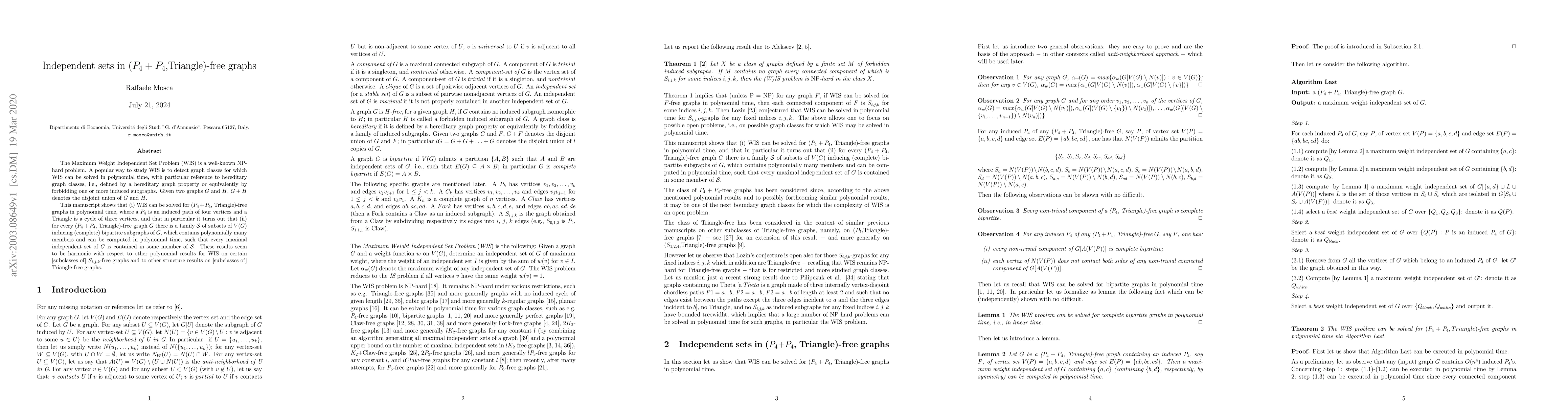 The Maximum Weight Independent Set Problem (WIS) is a well-known NP-hard problem. A popular way to study WIS is to detect graph classes for which WIS can be solved in polynomial time, with particular reference to hereditary graph classes, i.e., defined by a hereditary graph property or equivalently by forbidding one or more induced subgraphs. Given two graphs $G$ and $H$, $G+H$ denotes the disjoint union of $G$ and $H$. This manuscript shows that (i) WIS can be solved for ($P_4+P_4$, Triangle)-free graphs in polynomial time, where a $P_4$ is an induced path of four vertices and a Triangle is a cycle of three vertices, and that in particular it turns out that (ii) for every ($P_4+P_4$, Triangle)-free graph $G$ there is a family ${\cal S}$ of subsets of $V(G)$ inducing (complete) bipartite subgraphs of $G$, which contains polynomially many members and can be computed in polynomial time, such that every maximal independent set of $G$ is contained in some member of ${\cal S}$. These results seem to be harmonic with respect to other polynomial results for WIS on certain [subclasses of] $S_{i,j,k}$-free graphs and to other structure results on [subclasses of] Triangle-free graphs.
