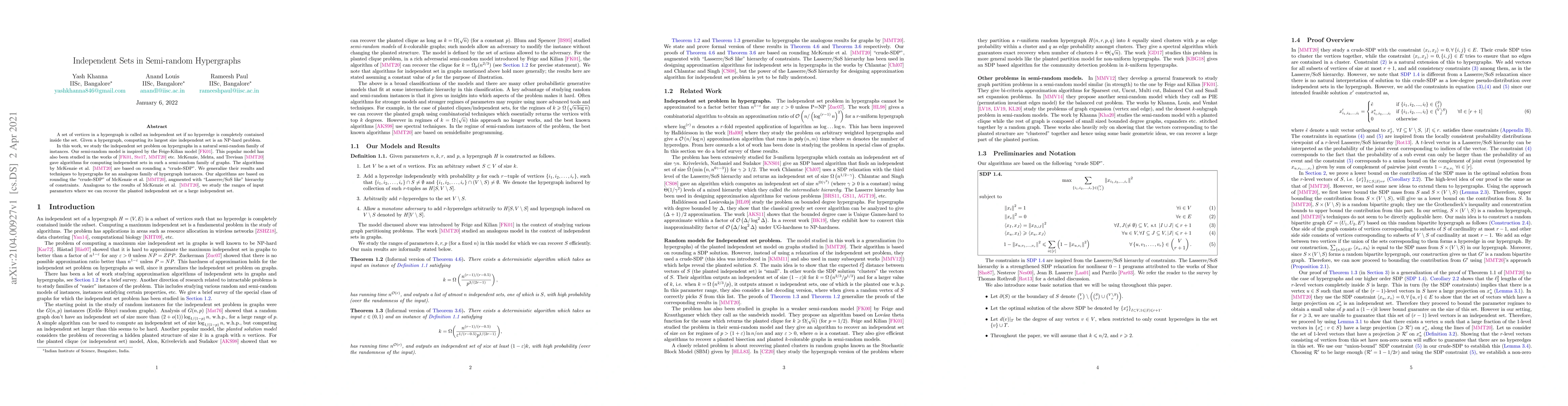 This paper studies the independent set problem in semi-random hypergraphs, generalizing previous results for graphs. The authors develop algorithms based on rounding a "crude-SDP" augmented with a hierarchy of constraints, and analyze their effectiveness in recovering planted independent sets.
