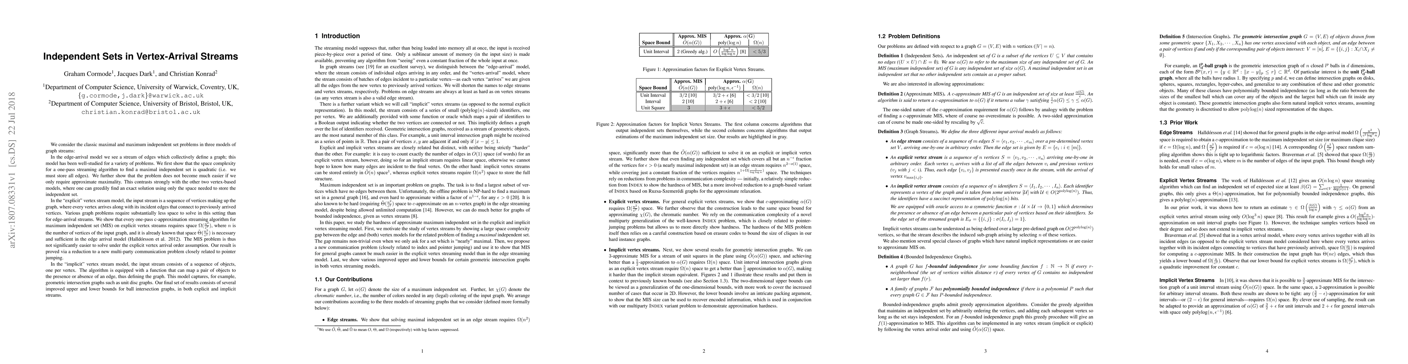 We consider the classic maximal and maximum independent set problems in three models of graph streams: In the edge-arrival model we see a stream of edges which collectively define a graph, this model has been well-studied for a variety of problems. We first show that the space complexity for a one-pass streaming algorithm to find a maximal independent set is quadratic (i.e. we must store all edges). We further show that the problem does not become much easier if we only require approximate maximality. In the "explicit" vertex stream model, the input stream is a sequence of vertices making up the graph, where every vertex arrives along with its incident edges that connect to previously arrived vertices. Various graph problems require substantially less space to solve in this setting than for edge-arrival streams. We show that every one-pass $c$-approximation algorithm for maximum independent set (MIS) on explicit vertex streams requires space $\Omega(\frac{n^2}{c^7})$, where $n$ is the number of vertices of the input graph, and it is already known that space $\tilde{\Theta}(\frac{n^2}{c^2})$ is necessary and sufficient in the edge arrival model (Halld\'orsson et al. 2012). The MIS problem is thus not significantly easier to solve under the explicit vertex arrival order assumption. Our result is proved via a reduction to a new multi-party communication problem closely related to pointer jumping. In the "implicit" vertex stream model, the input stream consists of a sequence of objects, one per vertex. The algorithm is equipped with a function that can map a pair of objects to the presence or absence of an edge, thus defining the graph. This model captures, for example, geometric intersection graphs such as unit disc graphs. Our final set of results consists of several improved upper and lower bounds for ball intersection graphs, in both explicit and implicit streams.
