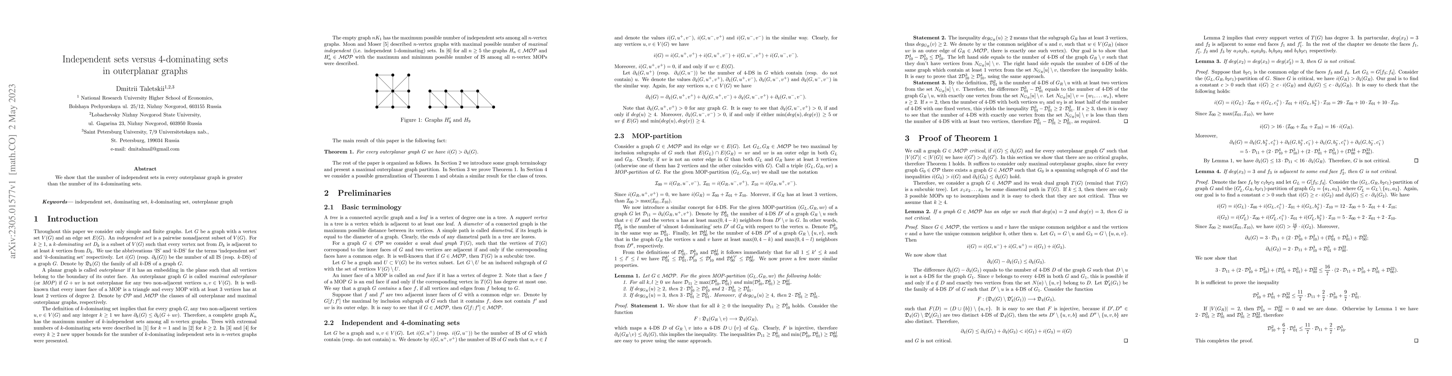 Summary: This paper demonstrates that outerplanar graphs contain more independent sets than 4-dominating sets, highlighting a significant structural difference in these graph configurations.