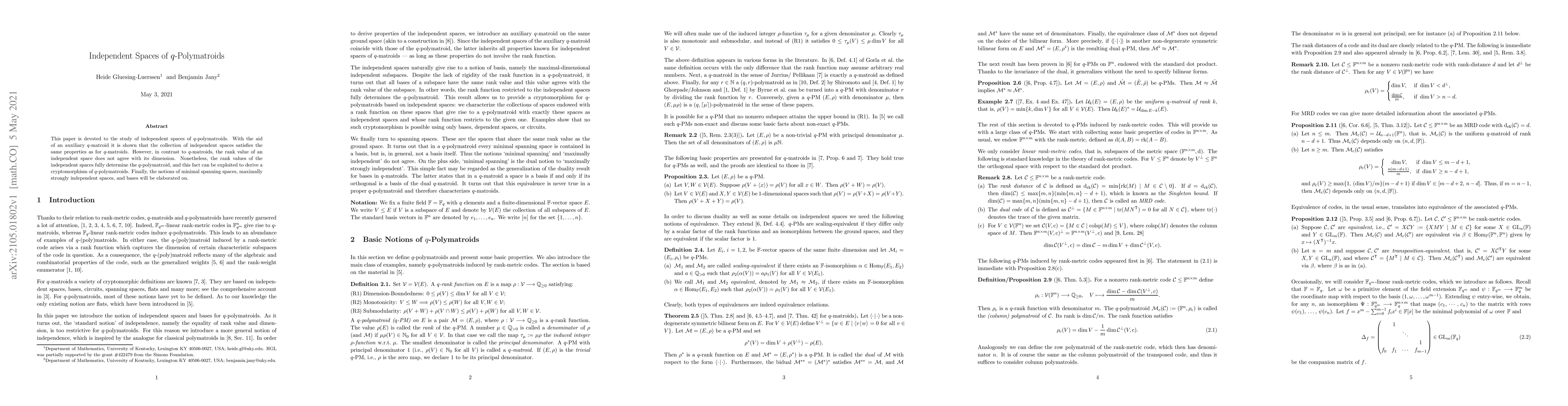 This paper explores the independent spaces of q-polymatroids, demonstrating that they share properties with q-matroids but differ in rank-dimension agreement. The rank values of independent spaces uniquely determine the q-polymatroid, and the study elaborates on minimal spanning spaces, maximally strongly independent spaces, and bases.