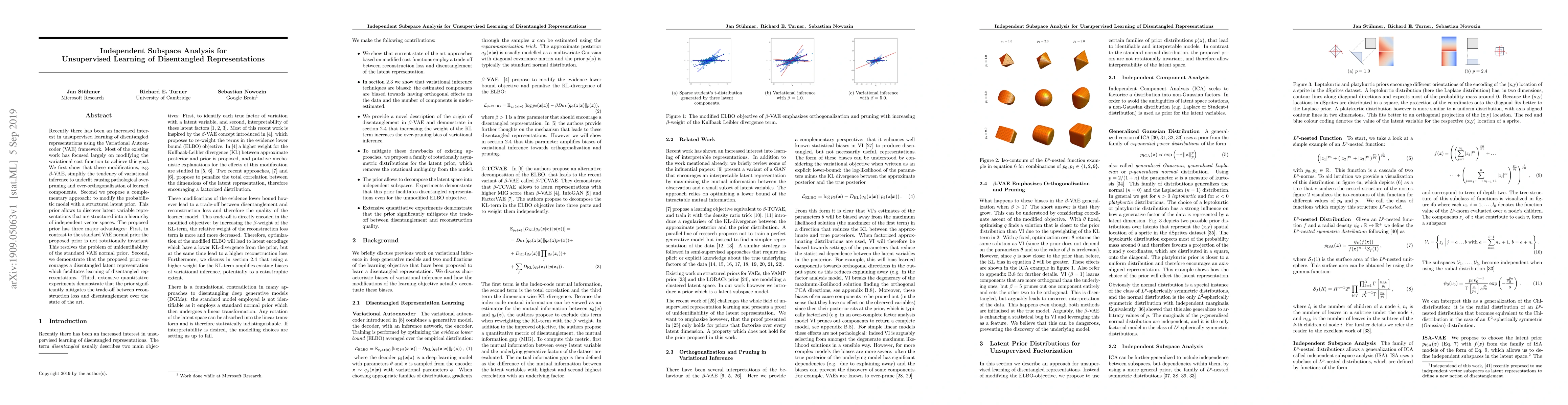 Recently there has been an increased interest in unsupervised learning of disentangled representations using the Variational Autoencoder (VAE) framework. Most of the existing work has focused largely on modifying the variational cost function to achieve this goal. We first show that these modifications, e.g. beta-VAE, simplify the tendency of variational inference to underfit causing pathological over-pruning and over-orthogonalization of learned components. Second we propose a complementary approach: to modify the probabilistic model with a structured latent prior. This prior allows to discover latent variable representations that are structured into a hierarchy of independent vector spaces. The proposed prior has three major advantages: First, in contrast to the standard VAE normal prior the proposed prior is not rotationally invariant. This resolves the problem of unidentifiability of the standard VAE normal prior. Second, we demonstrate that the proposed prior encourages a disentangled latent representation which facilitates learning of disentangled representations. Third, extensive quantitative experiments demonstrate that the prior significantly mitigates the trade-off between reconstruction loss and disentanglement over the state of the art.
