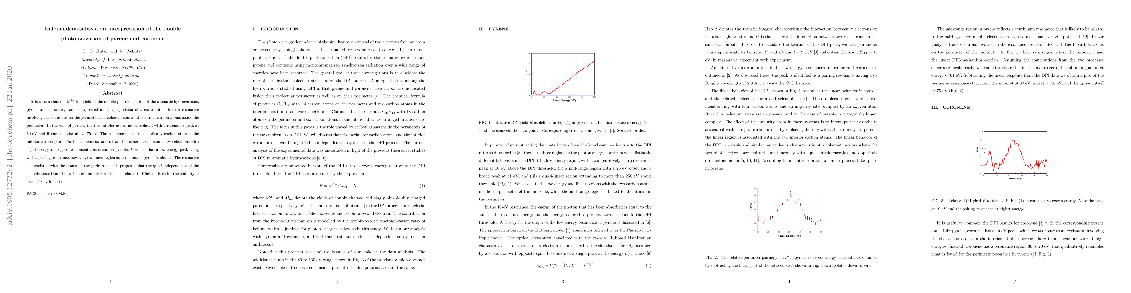 It is shown that the M$^{2+}$ ion yield in the double photoionization of the aromatic hydrocarbons, pyrene and coronene, can be expressed as a superposition of a contribution from a resonance involving carbon atoms on the perimeter and coherent contributions from carbon atoms inside the perimeter. In the case of pyrene, the two interior atoms are associated with a resonance peak at 10 eV and linear behavior above 75 eV. The resonance peak is an optically excited state of the interior carbon pair. The linear behavior arises from the coherent emission of two electrons with equal energy and opposite momenta, as occurs in pyrrole. Coronene has a low energy peak along with two pairing resonances, however, the linear region as in the case of pyrene is absent. The low energy resonance is associated with the atoms on the perimeter and the high energy resonance is associated with the hexagonal array of six carbon atoms at the center of the molecule. It is proposed that the quasi-independence of the contributions from the perimeter and interior atoms is related to H\"uckel's Rule for the stability of aromatic hydrocarbons.
