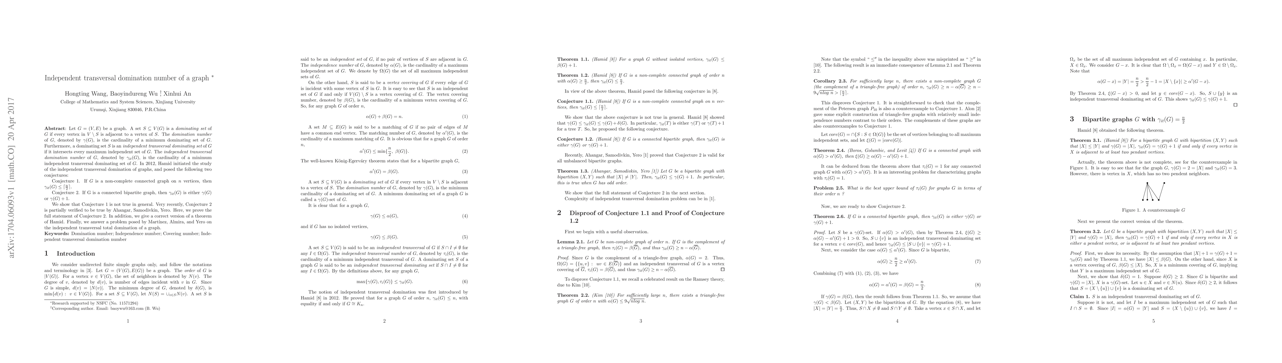 Let $G=(V, E)$ be a graph. A set $S\subseteq V(G)$ is a {\it dominating set} of $G$ if every vertex in $V\setminus S$ is adjacent to a vertex of $S$. The {\it domination number} of $G$, denoted by $\gamma(G)$, is the cardinality of a minimum dominating set of $G$. Furthermore, a dominating set $S$ is an {\it independent transversal dominating set} of $G$ if it intersects every maximum independent set of $G$. The {\it independent transversal domination number} of $G$, denoted by $\gamma_{it}(G)$, is the cardinality of a minimum independent transversal dominating set of $G$. In 2012, Hamid initiated the study of the independent transversal domination of graphs, and posed the following two conjectures: Conjecture 1. If $G$ is a non-complete connected graph on $n$ vertices, then $\gamma_{it}(G)\leq\lceil\frac{n}{2}\rceil$. Conjecture 2. If G is a connected bipartite graph, then $\gamma_{it}(G)$ is either $\gamma(G)$ or $\gamma(G)+1$. We show that Conjecture 1 is not true in general. Very recently, Conjecture 2 is partially verified to be true by Ahangar, Samodivkin, Yero. Here, we prove the full statement of Conjecture 2. In addition, we give a correct version of a theorem of Hamid. Finally, we answer a problem posed by Mart\'{i}nez, Almira, and Yero on the independent transversal total domination of a graph.