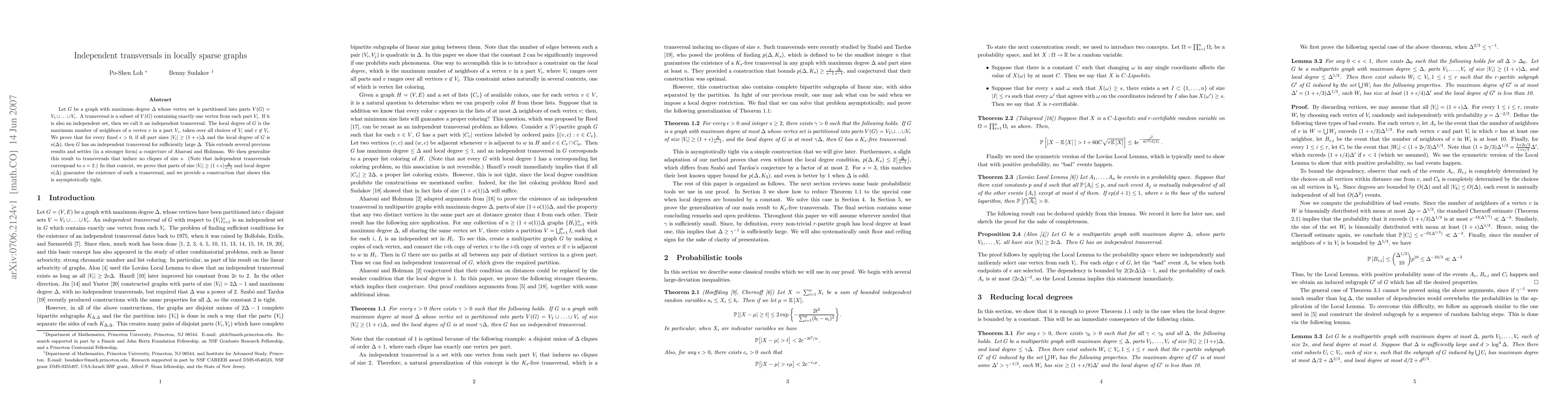 This paper proves the existence of an independent transversal in locally sparse graphs with a sufficiently large maximum degree and small local degree, extending previous results and settling a conjecture. It further generalizes the result to transversals that avoid cliques of size s, showing parts of adequate size and small local degree ensure such transversals exist.
