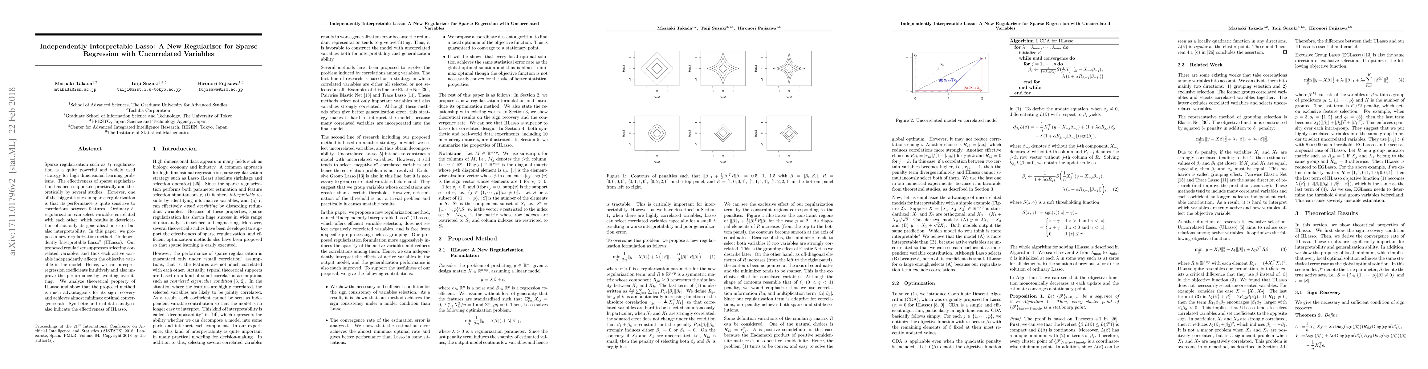 The paper introduces 'Independently Interpretable Lasso' (IILasso), a new regularization method for sparse regression. IILasso suppresses selection of correlated variables, enhancing interpretability and performance by avoiding overfitting. Theoretical analysis shows IILasso excels in sign recovery and achieves near-optimal convergence rate, supported by synthetic and real data analyses.