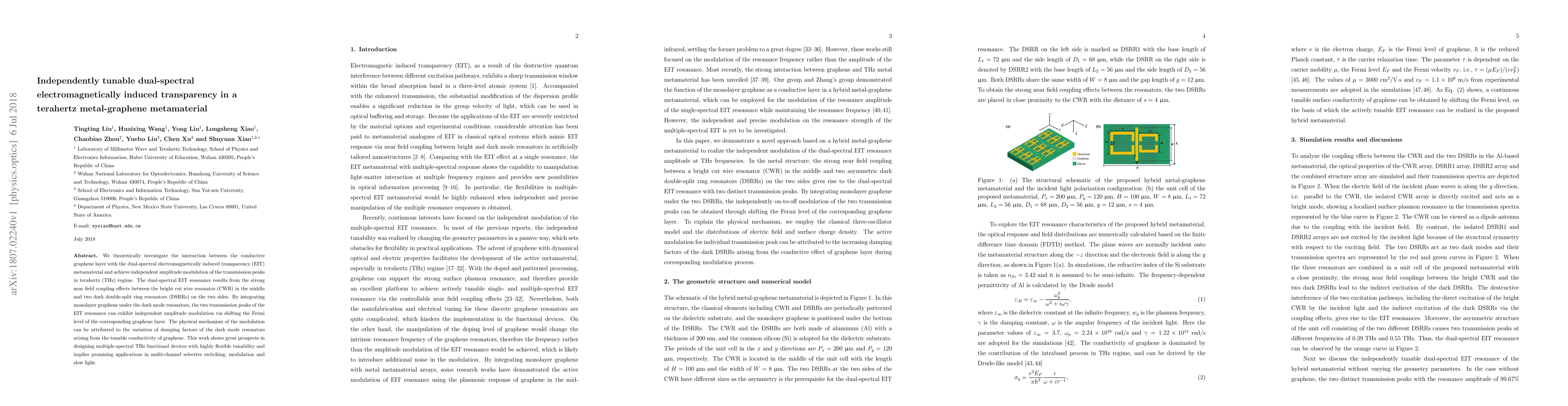This paper theoretically explores a dual-spectral electromagnetically induced transparency (EIT) metamaterial with terahertz (THz) transmission peaks independently tunable via graphene’s Fermi level, demonstrating potential for flexible THz device applications such as selective switching and modulation.